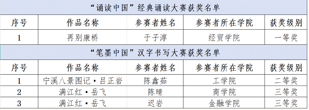 近日,吉林省教育厅公布了第六届中华经典诵写讲大赛获奖名单,在“诵读中国”经典诵读大赛、“笔墨中国”汉字书写大赛两个赛项中,我校4名学生获奖。其中,经贸学院于子淳荣获一等奖,工学院陈鑫如荣获二等奖,金融学院迟岩、商学院陈晴荣获三等奖,这是我校学生在该赛事中获得的最好成绩。