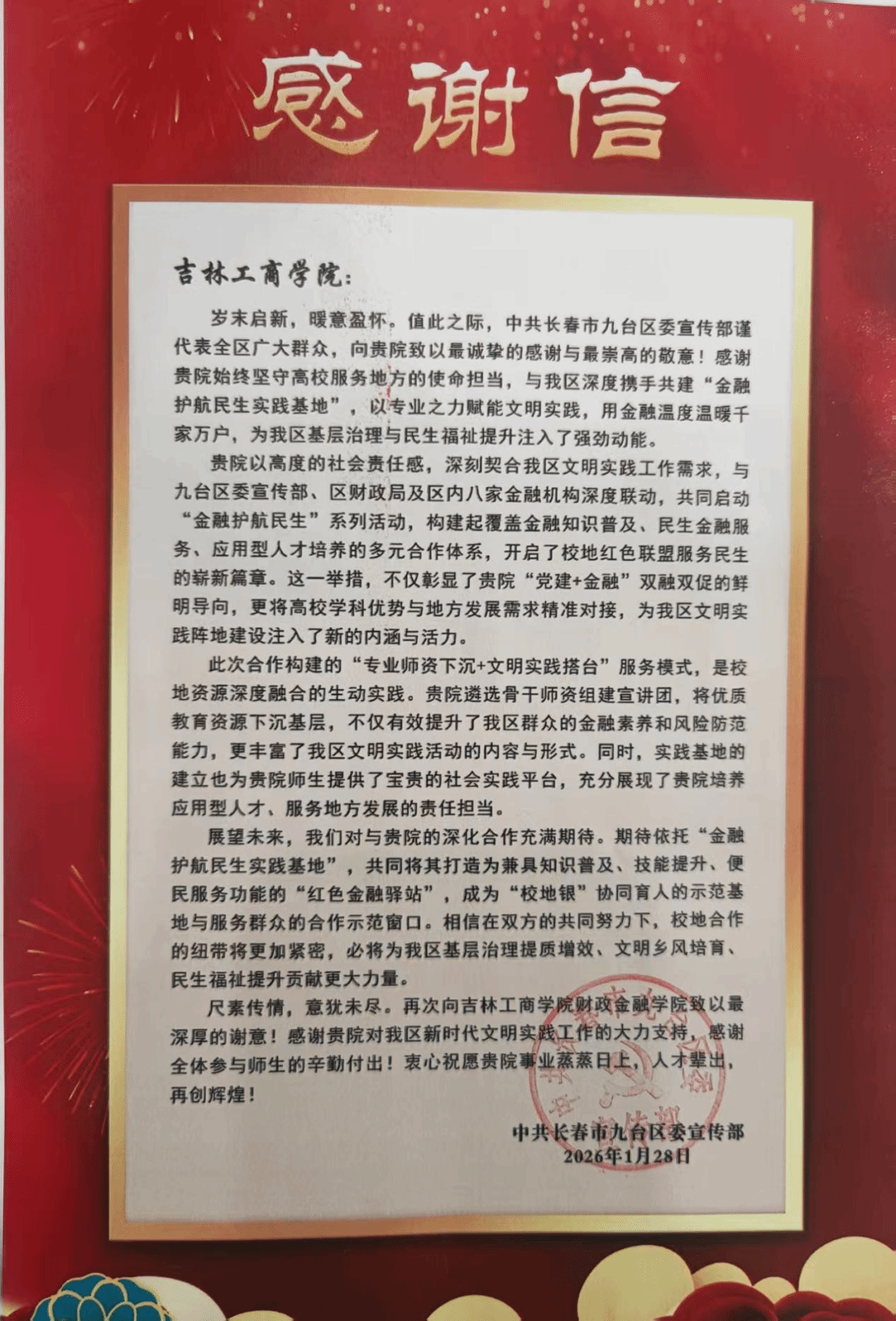 财政金融学院深入九台各社区开展精准化宣讲,以系列通俗实用的课程赢得群众广泛认可,并与九台区新时代文明实践中心建立常态化合作机制,将金融知识普及、民生金融服务、政策理论解读融入文明实践工作,构建起“校地联动、资源共享、服务直达”的合作模式,以专业宣讲践行社会责任,以校政协同厚植民生保障根基。