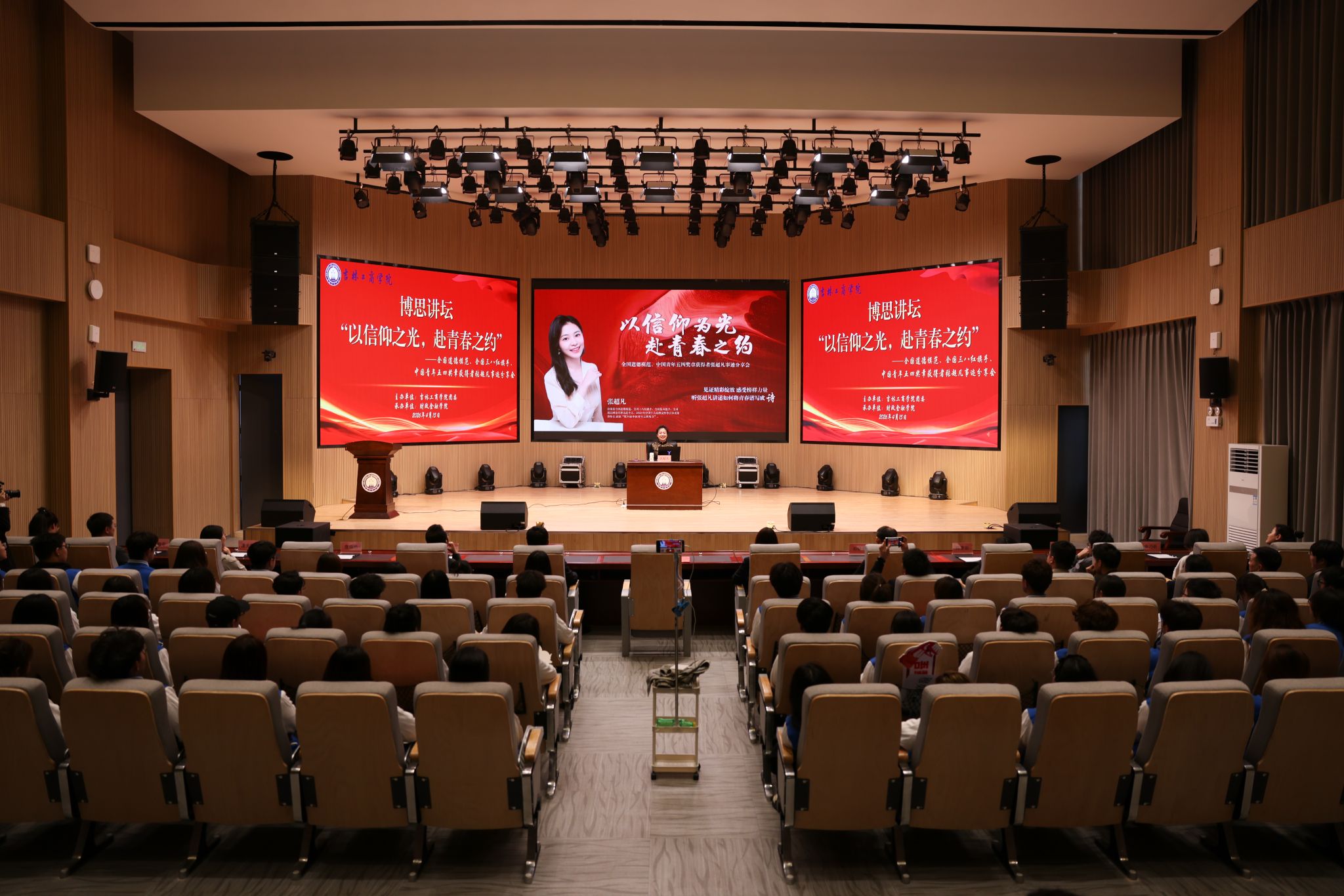 在热烈的掌声中,张超凡以“以信仰之光 赴青春之约”为主题,深情讲述了自己虽天生左臂缺失却从不向命运低头的成长历程。从年少斩获速滑冠军,到远赴山区支教,再到捐资助学、帮助残障人士就业创业,她用一个个真实感人的故事诠释了“生命的力量在于不屈,人生的精彩在于拼搏”的信念。作为长春理工大学团委副书记、教授,她还分享了自己在思政教育创新方面的探索,鼓励同学们将个人理想融入吉林振兴发展的大局,留在吉林、向下扎根、向上生长。