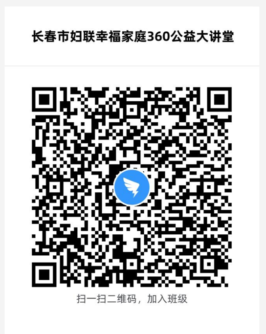 1.此次活动以钉钉APP线上视频直播方式开展(可看课程回放),全校教职工均可下载钉钉APP,用钉钉扫描二维码(二维码见下图),选择“我是学生”进入长春市妇联“幸福家庭360”公益大讲堂云课堂,名额不限。请实名制进群,进群即视为报名。