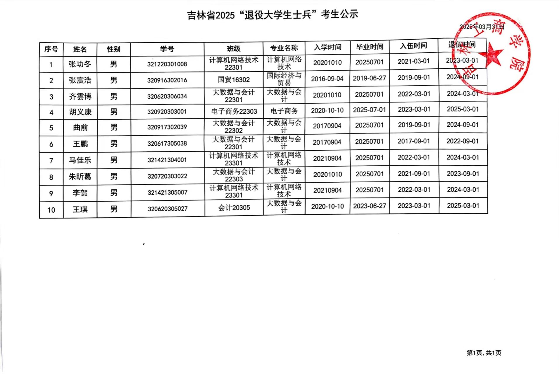 根据《关于做好吉林省2025年普通高等学校专升本考试招生工作的通知》有关精神,经学生本人申请,教务处(招生工作办公室)招生科审核,有10名“退役大学生士兵”考生拟通过学校审核,现将名单予以公示,公示时间从2025年3月31日至2025年4月8日。如有异议,请拨打电话:0431-82306253。
