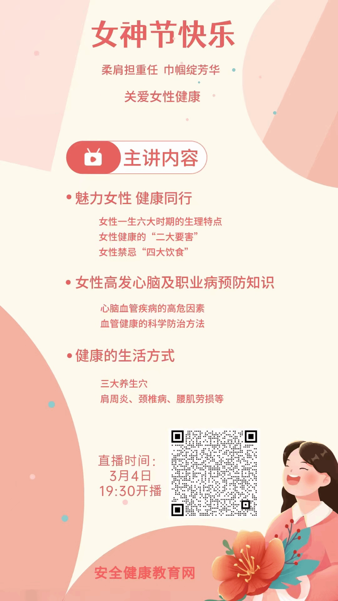 为提高广大女教职工和女大学生健康意识,加强健康教育,切实提升自我防护能力,倡导正确的健康观念,远离疾病,做好自己健康第一责任人,省安全健康教育中心为我校开展线上云课堂“3.8节关爱女性健康”专项讲座。