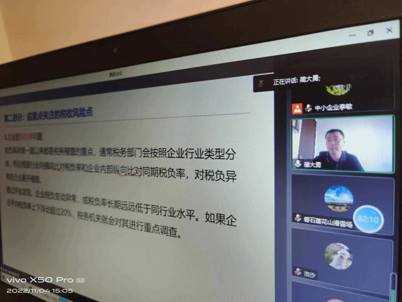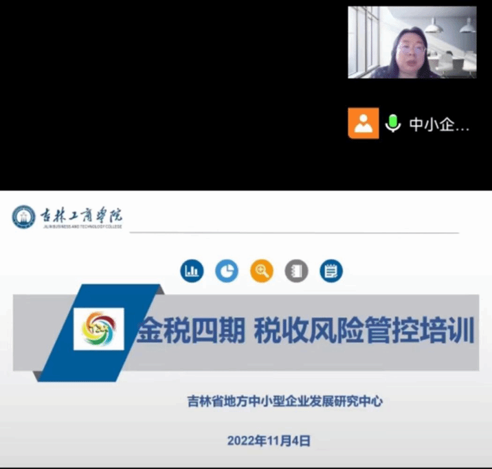 11月4日,我校“吉林省地方中小型企业研究中心”成功举办中小型企业线上专题培训会议,本次会议是应吉林官马莲花山国家森林公园、吉林双大集团两家企业邀请开展的针对中小企业新形势下如何应对税收风险而开展的专题培训会议。吉林官马莲花山国家森林公园财务总监吕佳,吉林双大集团董事长徐实、财务总监刘丽莉、财务部长乔波,以及省内外10余家中小企业的财务经理、财务管理人员共同参加了本次培训。讲座由吉林工商学院“吉林省地方中小型企业发展研究中心”副主任李敏主持。