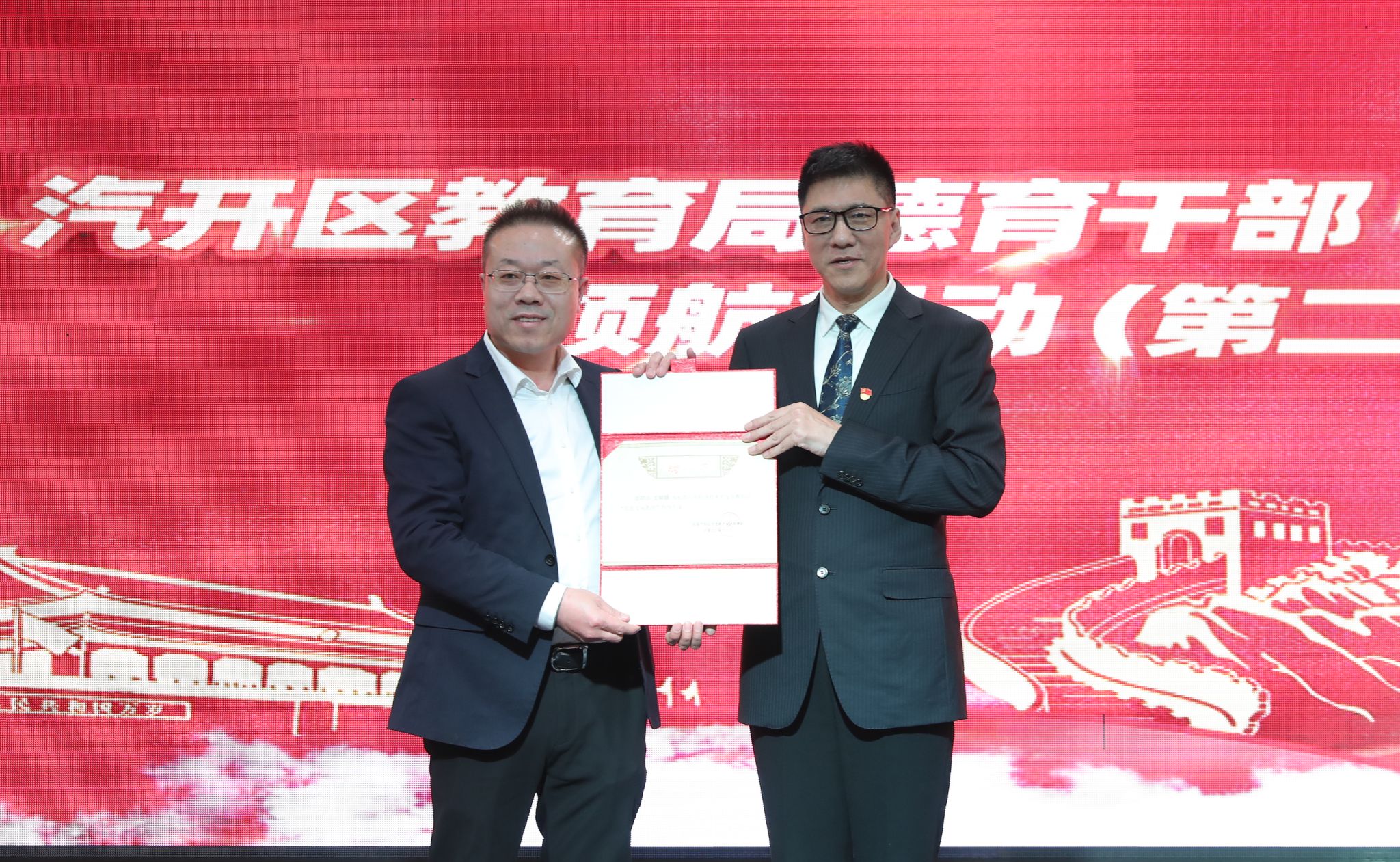 王明明老师被聘为汽开区教育局“红色文化教育指导专家”,并为大家上了一堂别出心裁的“微党课”,他把红色基因、红色传统、红色精神艺术地结合起来,让党史教育、红色文化教育增添中国式的浪漫。党课结束后,周国兵为王明明颁发了聘书。