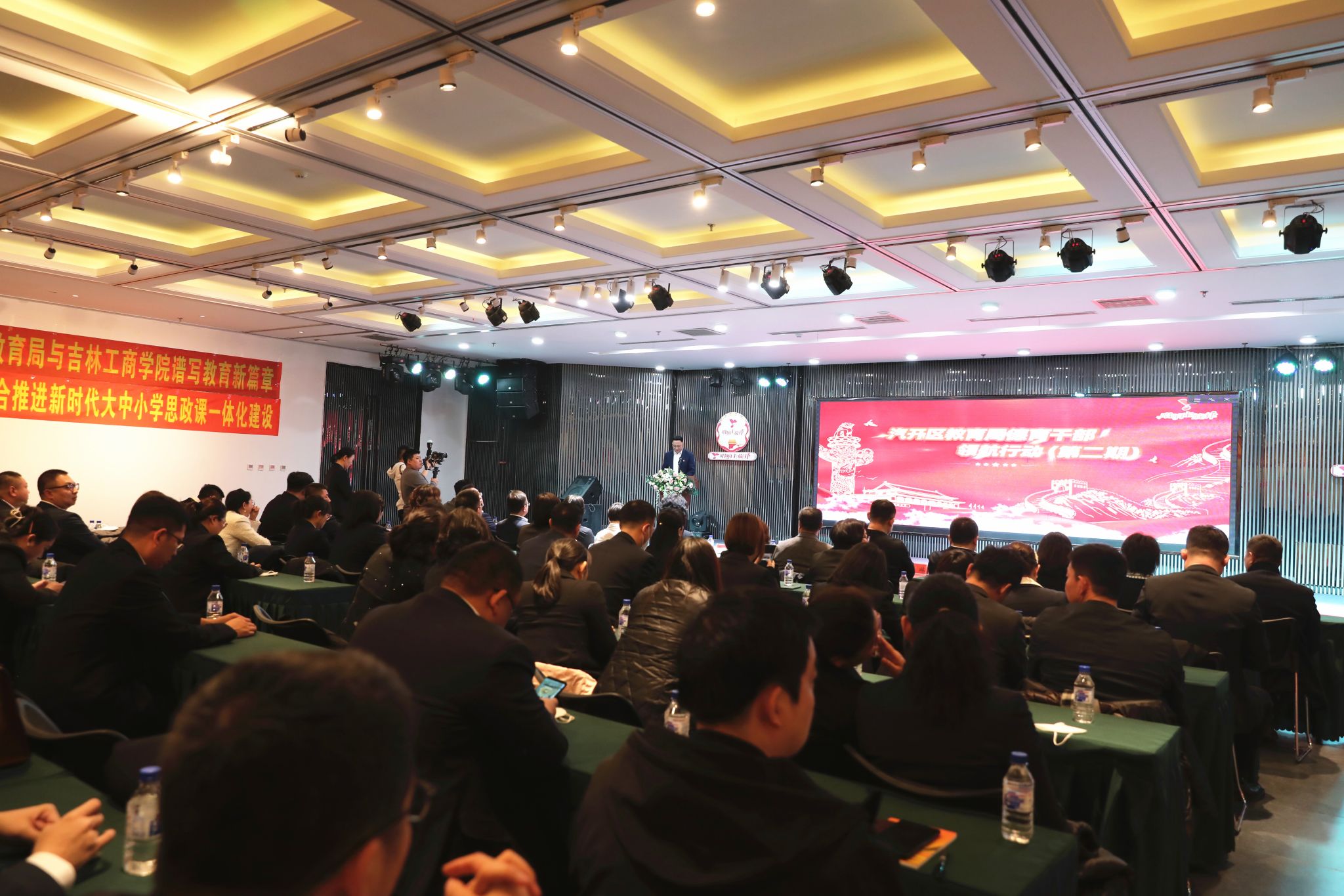 徐文在致辞中指出,我校王明明老师创作的《人民教师心向党》《家风》《雷锋精神代代传》等正能量歌曲广为传唱,并作为“汽开区德育干部领航行动”的主打产品为汽开区的德育教育事业做出贡献,这既是我校教师教育情怀的彰显,更是吉林工商学院服务社会、回报社会的具体体现,同时也是吉林工商学院把大中小学思政课一体化建设向纵深推进的基础。我校将与汽开区教育局携手努力,借助汽开区的领航行动,大力推进吉林工商学院与汽开区“幼小初高大”思政课一体化建设,共同探索建立集体备课、科研攻关、教学研究、实践研修共享机制,谱写新时代吉林工商学院及汽开区大中小学思政课一体化建设新篇章。