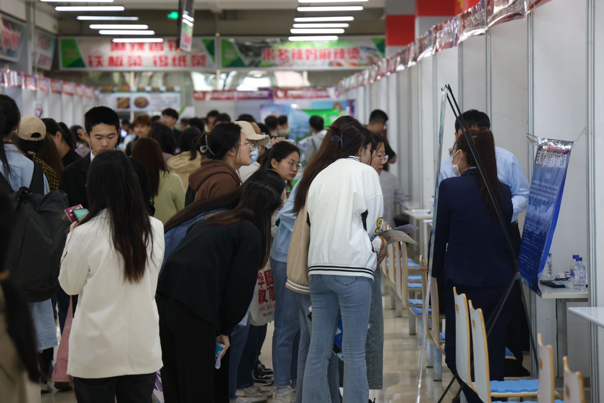 招聘会现场人头攒动,毕业生求职热情高涨、求职意愿强烈,在各招聘展位前,求职毕业生认真了解企业用人需求、薪资待遇、晋升空间、工作环境等内容。招聘人员“卯足劲”吸纳人才,热情地解答毕业生提出的问题。