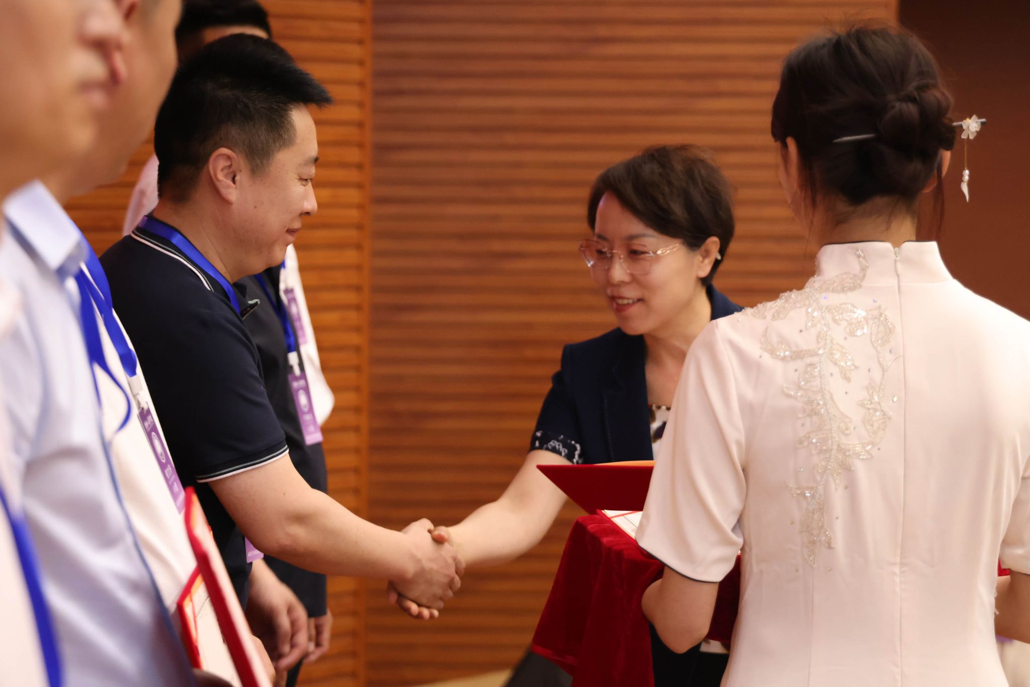 张越杰向优秀校友代表赠送了新版校徽以资纪念。
