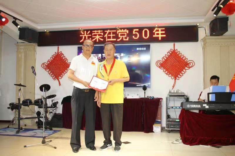 离退休工作处处长王永昌宣读“光荣在党50年”名单,袁民为“光荣在党50年”代表王金颁发证书和荣誉奖章。