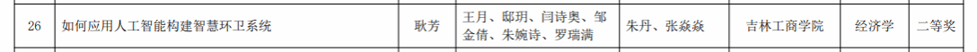 为深入学习贯彻党的二十大精神和习近平总书记关于教育的重要论述,系统加强基础学科拔尖学生培养,近日,吉林省教育厅举办了首届吉林省基础学科拔尖学生“提问与猜想”活动。经高校推荐、专家评审、公示审核,由我校经贸学院教师朱丹、张焱焱指导,电子商务专业耿芳等学生参赛的项目《如何应用人工智能构建智慧环卫系统》荣获二等奖。