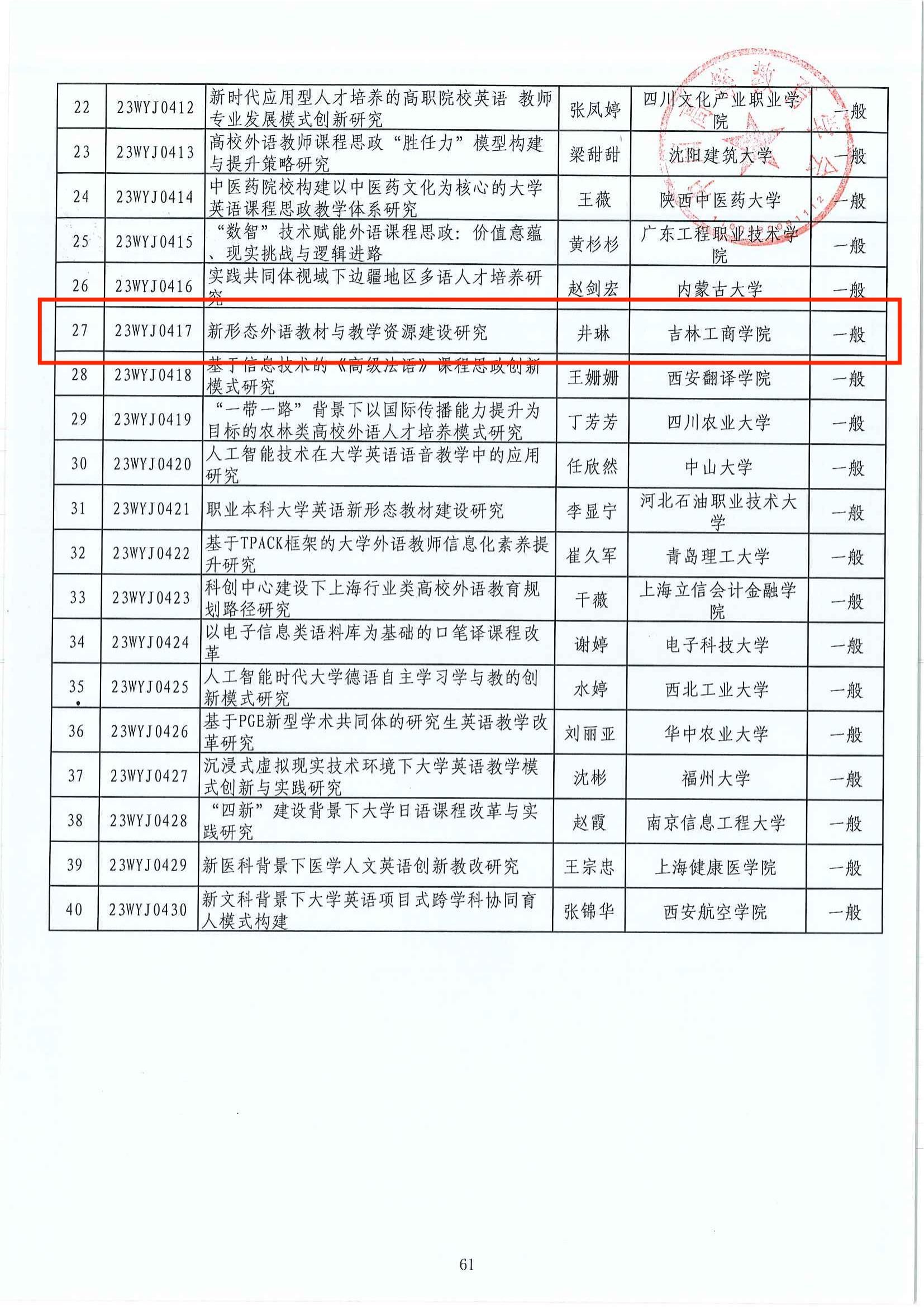 本年度中国高等教育学会规划课题申报为深入贯彻党的二十大精神,全面贯彻落实习近平总书记关于教育的重要论述和全国教育工作会议精神,加快推动高等教育高质量发展,开展有组织的教育科研而开展。我校杨明莉教授申报的《基于创新创业导向的新时代大学生振兴乡村科教志愿服务体系研究》获批第二类“数字教育背景下高等学校创新创业教育改革研究”一般课题立项。井琳老师申报的《新形态外语教材与教学资源建设研究》获批第二类“新时代高校外语教育高质量发展研究”一般课题立项。