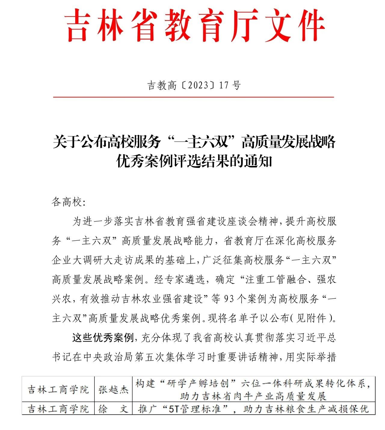 日前,吉林省高校服务“一主六双”高质量发展战略优秀案例评选结果公布,共有52所高校的93个优秀案例入选,我校张越杰校长申报的《构建“研学产孵培创”六位一体科研成果转化体系,助力吉林省肉牛产业高质量发展》和徐文副校长申报的《推广“5T管理标准”,助力吉林粮食生产减损保优》获评优秀案例。