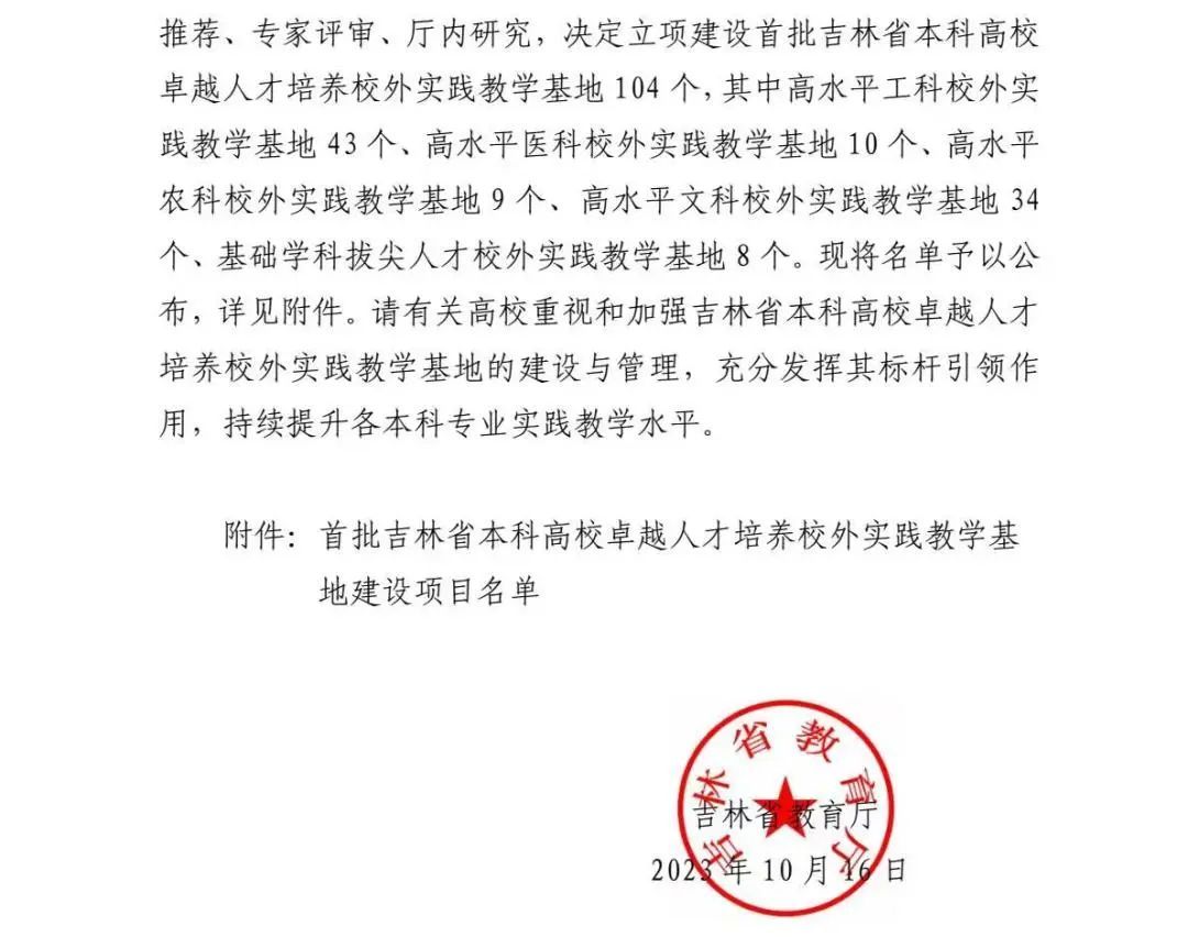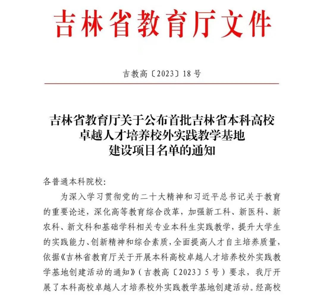 近日,吉林省教育厅公布了首批吉林省本科高校卓越人才培养校外实践教学基地建设立项名单。全省首批建设新工科、新医科、新农科、新文科和基础学科实践教学基地共104个,其中高水平文科校外实践教学基地共34个。