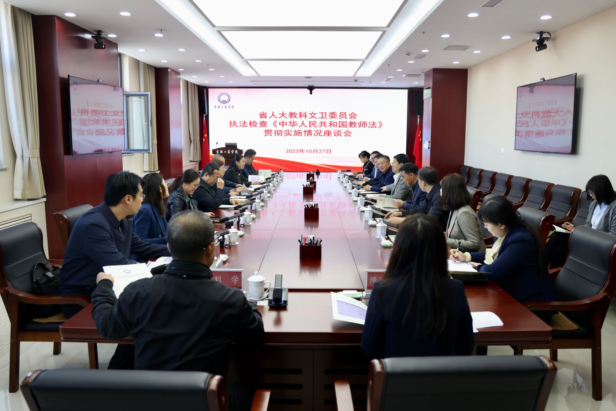我校党委副书记、校长、省人大民族侨务外事委员会委员张越杰,党委副书记迟柏龙,副校长徐文和学校办公室、党委教师工作部、发展规划与政策法规处、教务处(教师教学发展中心)、工会等相关部门负责同志和部分教师代表参加此次检查活动。座谈会由张越杰主持。