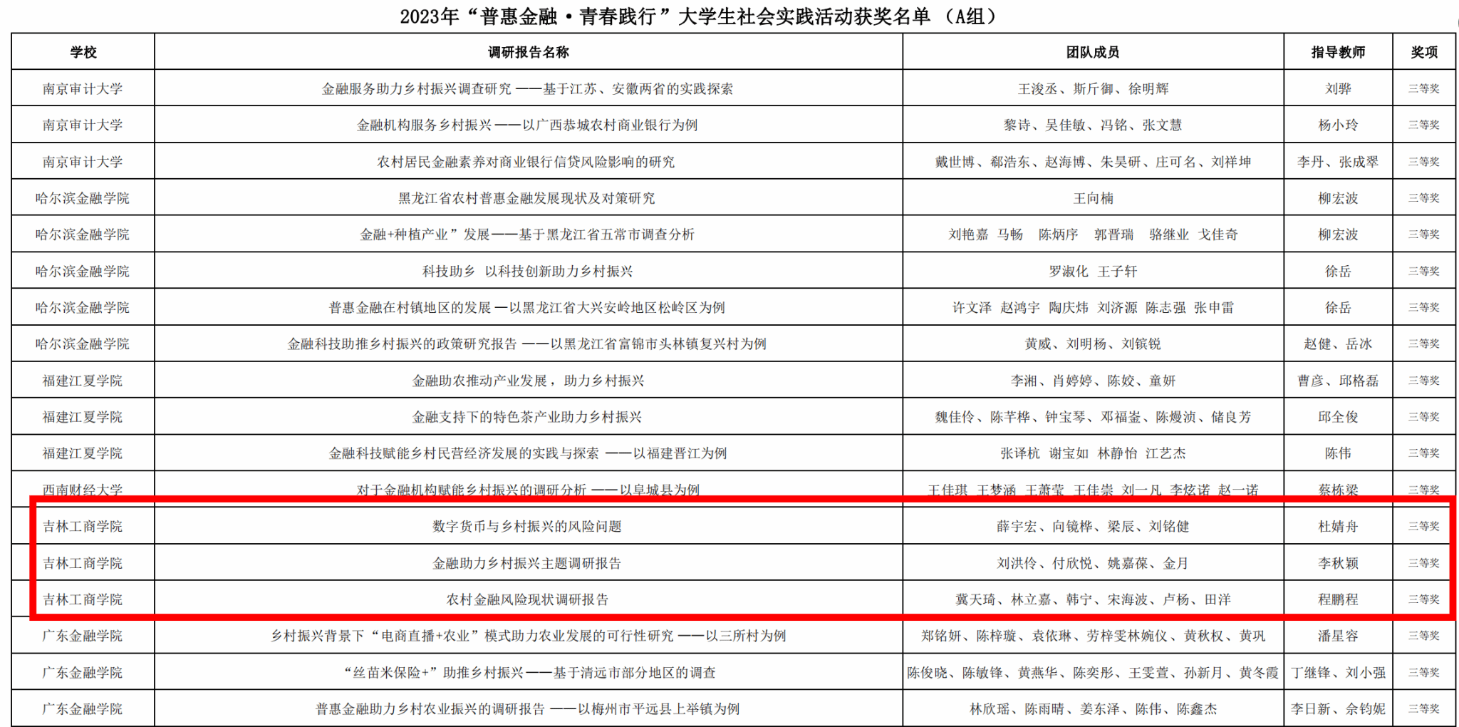 近日,中国金融教育发展基金会公布了2023年“普惠金融·青春践行”大学生社会实践活动的评审结果,我校金融学院首次参赛,斩获调研报告(A组)三等奖3项。