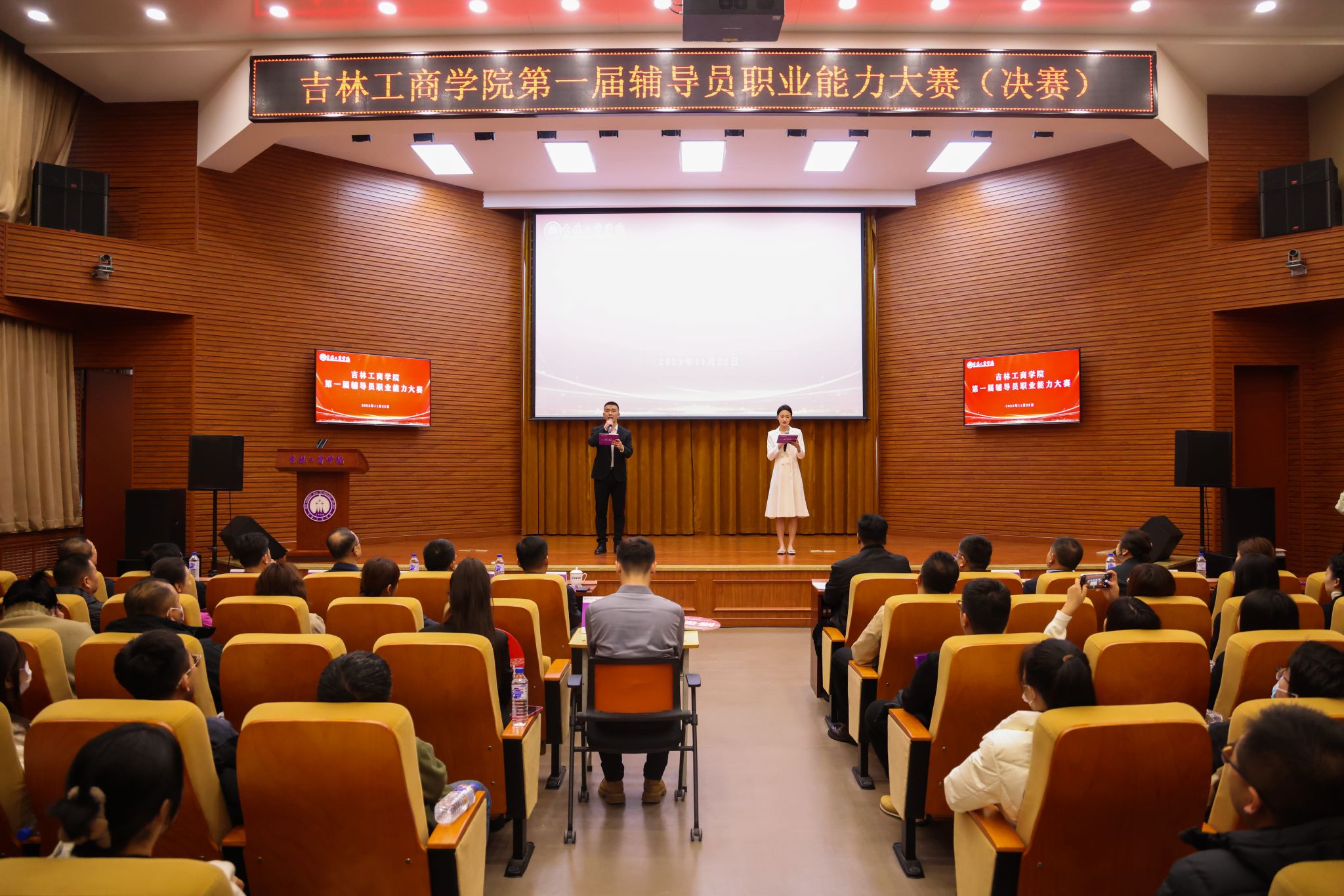 为深入学习贯彻习近平新时代中国特色社会主义思想和党的二十大精神,通过“以赛代练、以赛代训、以赛促学、以赛促干”,进一步提升我校辅导员的五大核心能力,真正建设一支师德高尚、业务精湛、结构合理、充满活力的辅导员队伍,11月22日,吉林工商学院第一届辅导员职业能力大赛(决赛)在第二教学楼A区429报告厅举办。