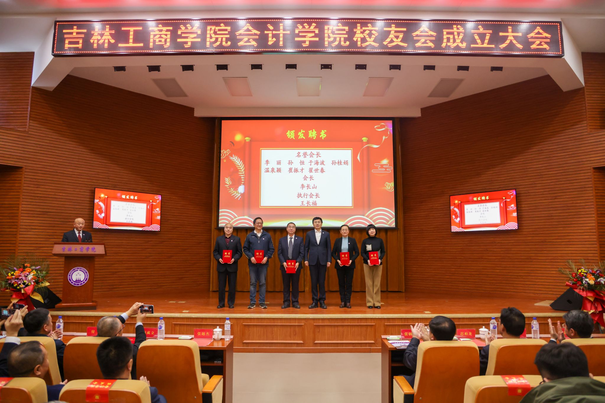 12月10日,吉林工商学院会计学院校友会成立大会在第二教学楼A区429报告厅举行。学校党委书记张炳辉,党委副书记、校长张越杰,党委副书记迟柏龙出席大会。学校校友工作办公室等相关职能部门代表、会计学院全体教职员工、来自全国各地的优秀校友代表以及学生代表共计260余人参加了大会。会计学院党委书记翟世春主持大会。