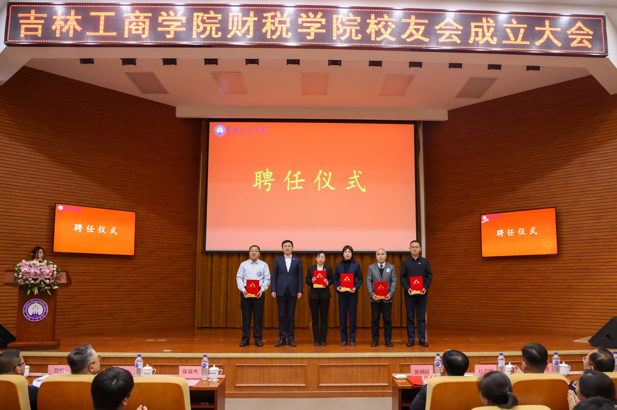 张越杰为财税学院校友会理事会会长、名誉会长和执行会长颁发聘书。杜希刚为财税学院校友会理事会副会长颁发聘书。徐文为财税学院校友会授旗。