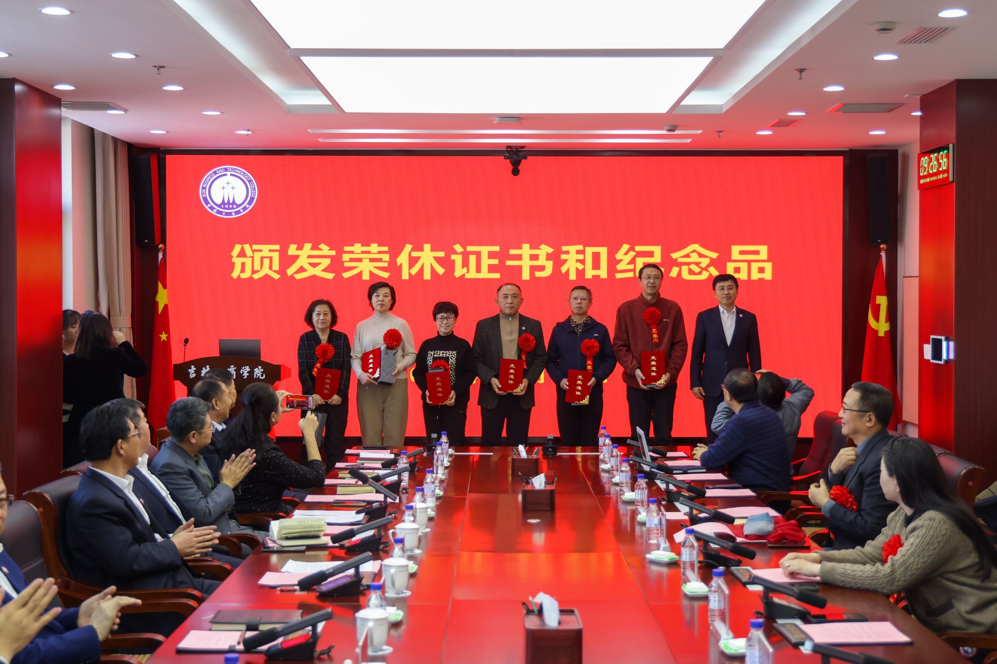 在充满温情与感动的氛围中,张越杰、迟柏龙、徐文依次为到会的十七位退休同志代表颁发荣休证书和纪念品,表达学校对他们的感谢与祝福。