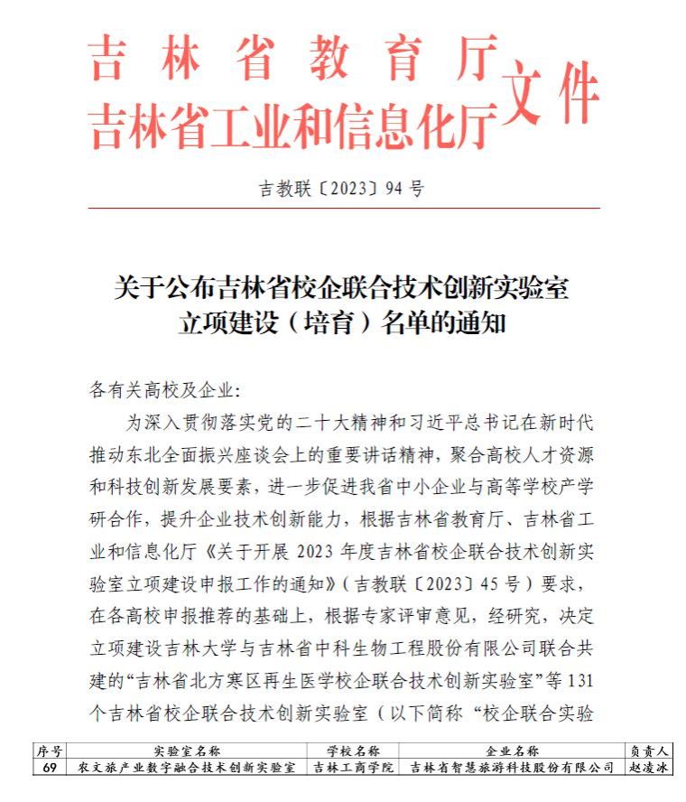 近日,吉林省教育厅发布了《关于公布吉林省校企联合技术创新实验室立项建设(培育)名单的通知》,经学校推荐、专家评审,本次吉林省拟立项建设校企联合技术创新实验室131个,立项培育校企联合技术创新实验室46个。我校与吉林省智慧旅游科技股份有限公司共同申报的“农文旅产业数字融合技术创新实验室”在省内众多参评院校中脱颖而出,成功获批立项建设,标志着我校在科研创新平台申报建设工作中取得了又一重大突破。