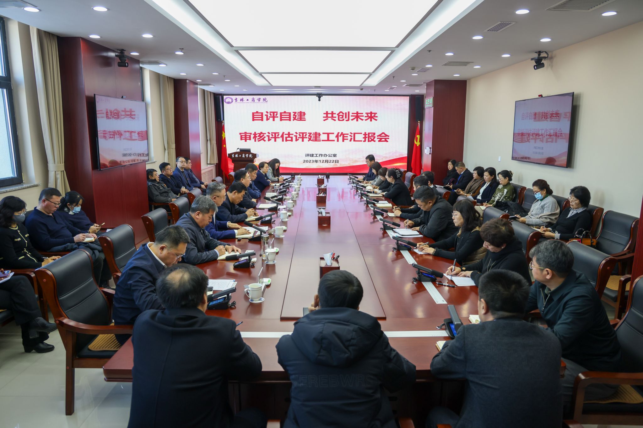 为贯彻落实《吉林工商学院本科教育教学审核评估评建工作方案》,进一步推进审核评估工作,12月22日,学校在综合办公楼702会议室召开了主题为“自评自建 共创未来”的审核评估评建工作汇报会议。党委书记张炳辉,党委副书记杜希刚、迟柏龙,副校长徐文、管清平、张熙奀出席会议。