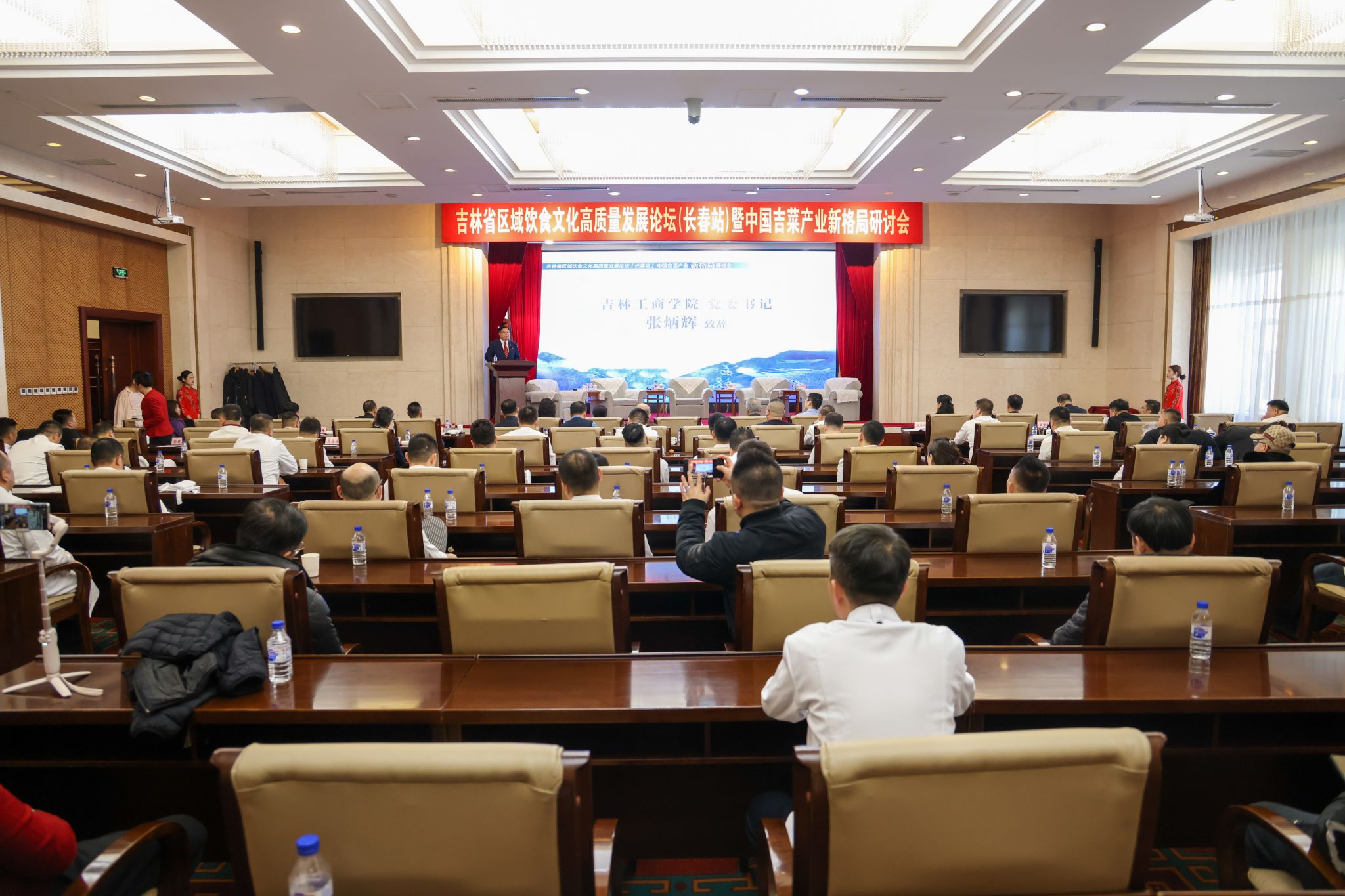2月26日,由吉林省商务厅指导,吉林工商学院联合吉林省饮食文化研究会、吉林日报彩练新闻“翠花走千村”栏目组共同主办的吉林省区域饮食文化高质量发展论坛(长春站)暨中国吉菜产业新格局研讨会在吉林省长春市春谊宾馆召开。吉林工商学院党委书记张炳辉教授、吉林省商务厅二级巡视员杨宏伟出席论坛。