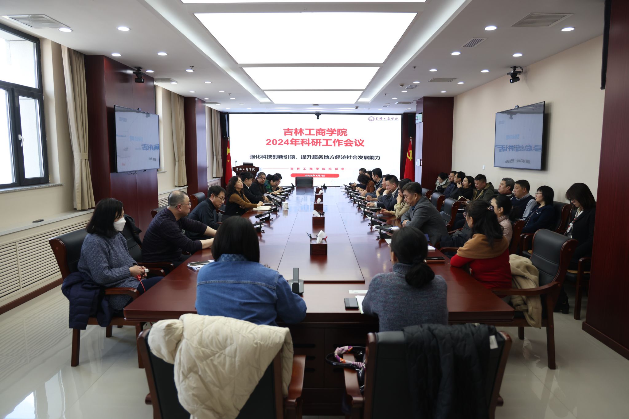 为强化科技创新引领,提升服务地方经济社会发展能力,深入学习贯彻上级科研工作会议精神,全面梳理总结学校2023年度科研工作进展情况,高标准做好2024年度科研工作,进一步振奋精神、凝聚共识,推动学校科研工作高质量发展,3月7日,学校在综合办公楼702会议室召开了吉林工商学院2024年度科研工作会议。副校长董本云出席会议并讲话,会议由科研处处长赵凌冰主持。
