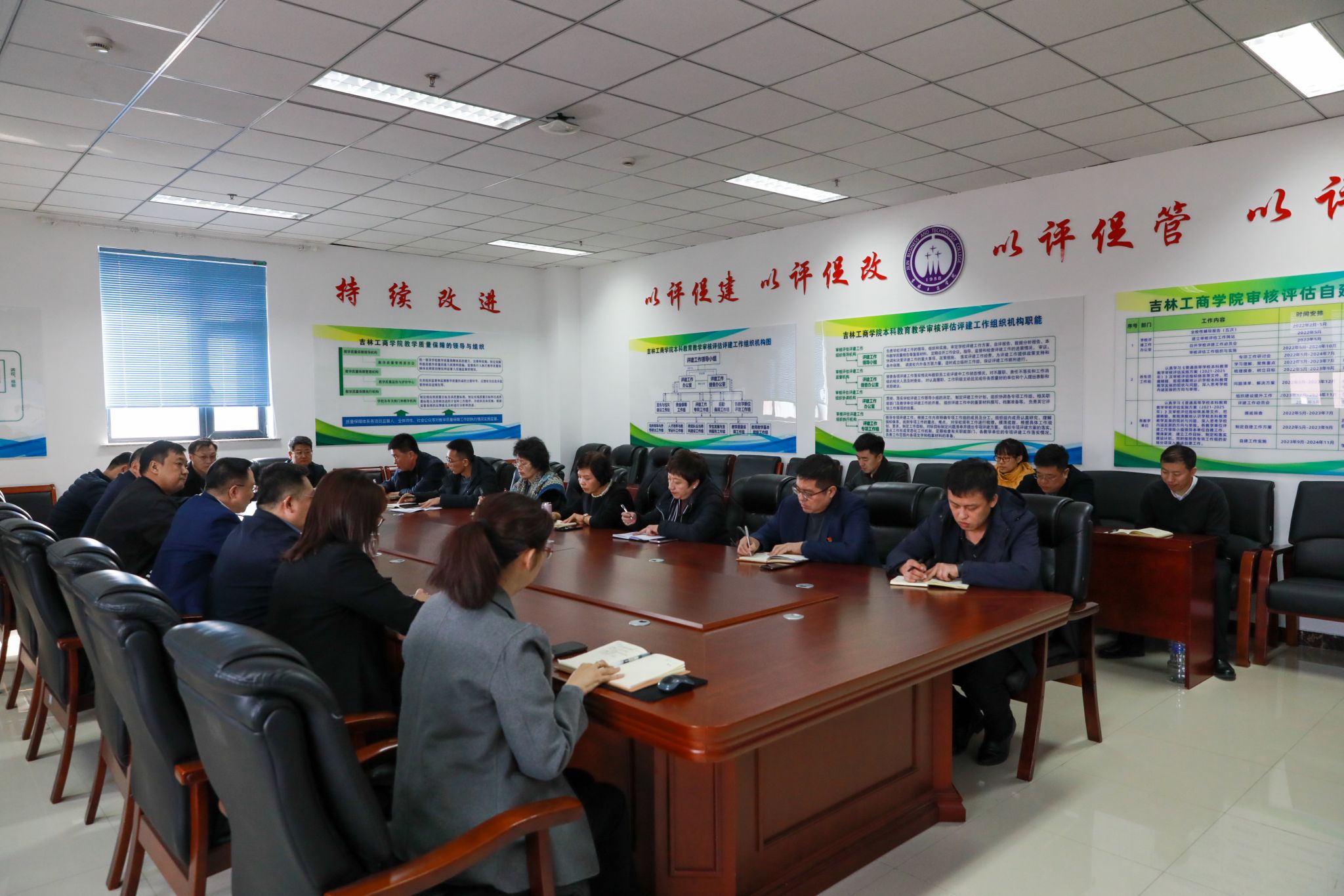 审核评估评建督查办公室成员,宣传与校风建设工作组、资金保障工作组、后勤保障工作组、评建专项工作组副组长及成员单位负责人,评建材料组、质量控制组、信息化技术保障组部分成员,评建工作办公室工作人员参加了会议。