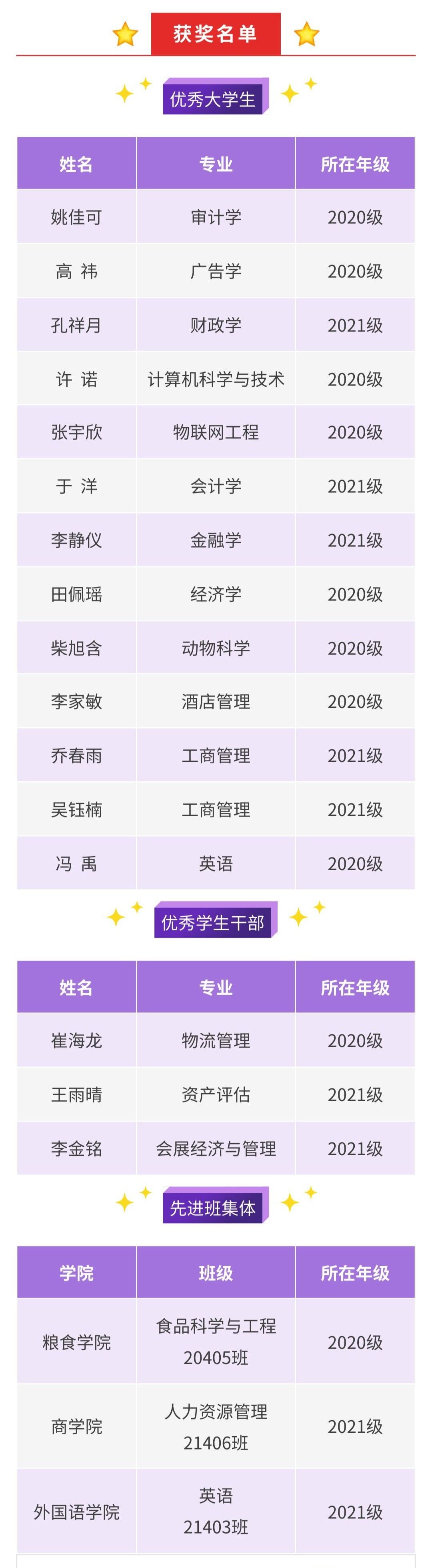 近期,吉林省教育厅发布了《关于公布2023年吉林省普通高校省级优秀大学生(标兵)、优秀学生干部(标兵)和先进班集体名单的通知》,我校会计学院姚佳可等13名学生荣获“吉林省优秀大学生”,商学院崔海龙等3名学生获评“吉林省优秀学生干部”,粮食学院20405班等3个班级获评“吉林省先进班集体”。