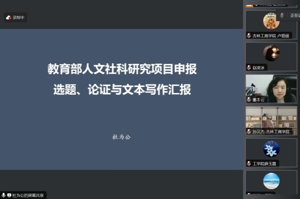 为进一步推进我校国家级科研项目培育工作效果,拓宽科学研究思路,提升科研能力,持续提高项目申报质量和申报成功率,3月20日,学校特邀武汉轻工大学经济学院杜为公教授为我校教师作“教育部人文社科研究项目申报”线上讲座。副校长董本云出席本次会议并讲话,会议由科研处处长赵凌冰主持。