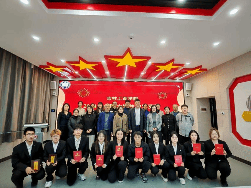 与会领导为获奖师生颁奖,工学院网络工程21404班李健作为获奖学生代表发言,他对学校和老师的悉心培养表示感谢,对参赛指导教师的卓越学识和无私奉献表示敬佩,表示将珍惜荣誉,加倍努力学习,回报老师和学校。