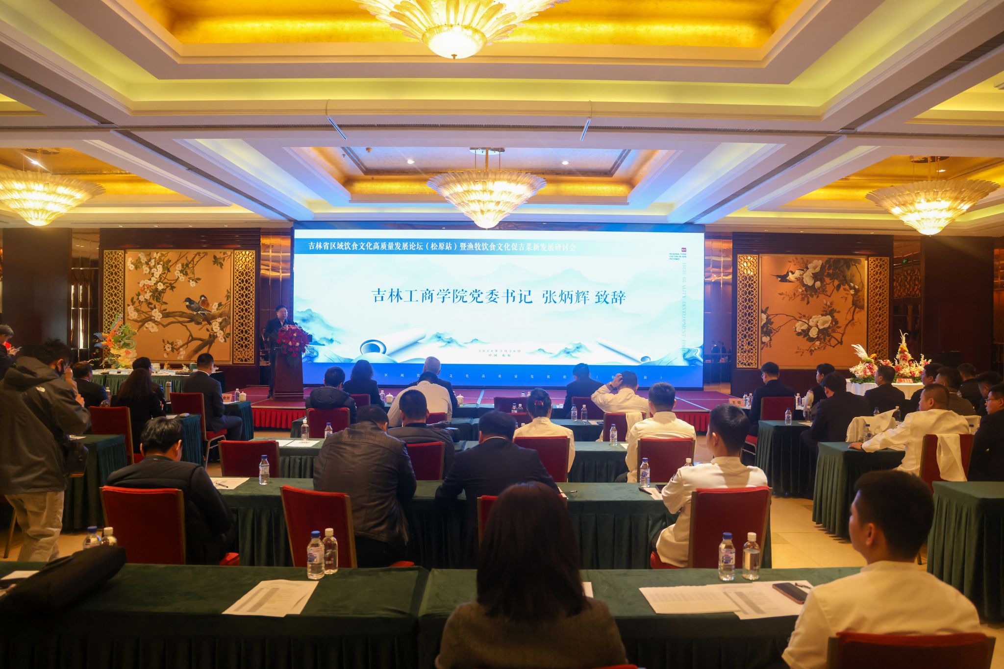 为促进吉林省区域饮食文化高质量发展,探讨渔牧饮食文化对吉菜的新发展,3月26日,吉林省区域饮食文化高质量发展论坛(松原站)暨渔牧饮食文化促吉菜新发展研讨会在松原市郭尔罗斯饭店举行。论坛由吉林工商学院、松原市商务局、吉林省饮食文化研究会、吉林日报彩练新闻“翠花走千村”栏目组联合主办。吉林工商学院党委书记张炳辉、副校长董本云,松原市商务局局长张丹东等领导出席研讨会。