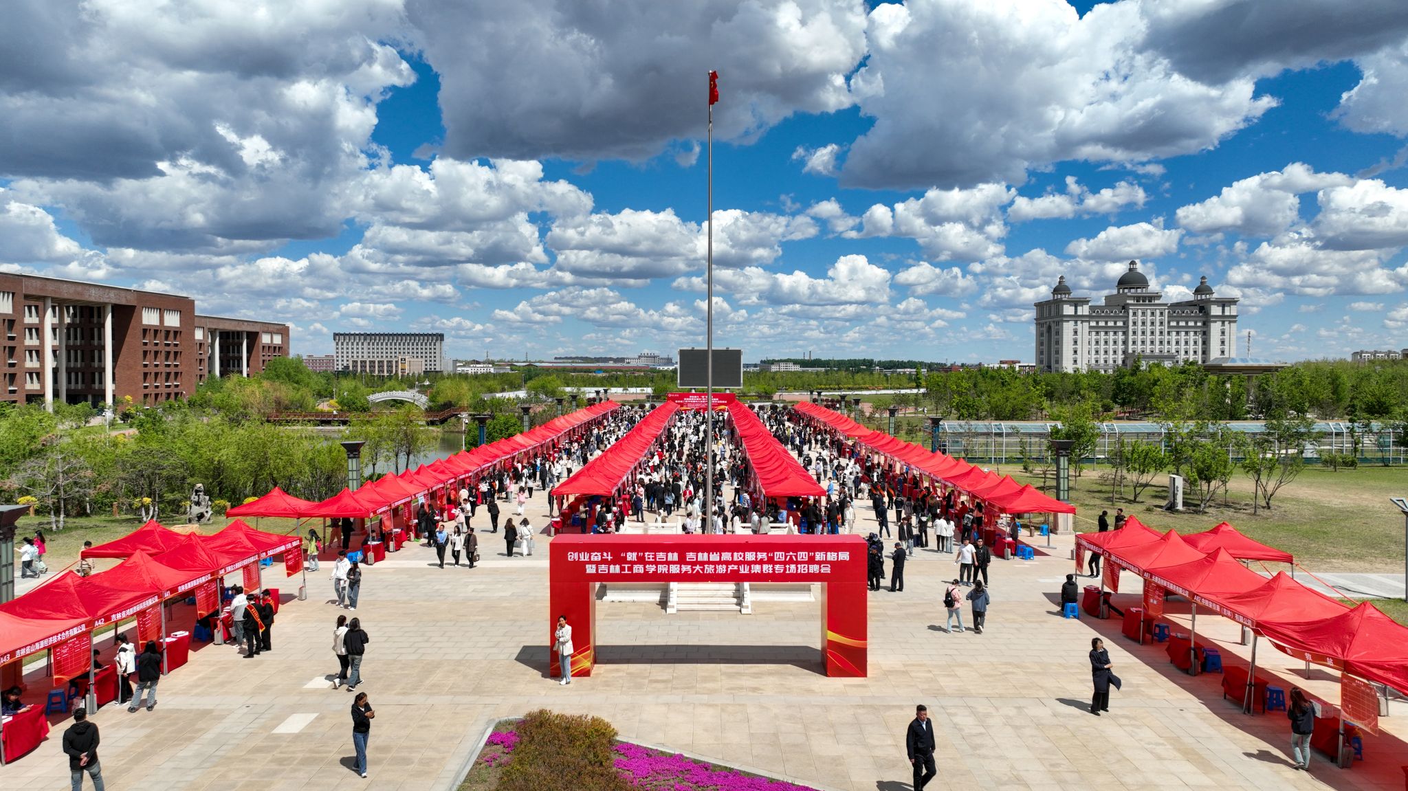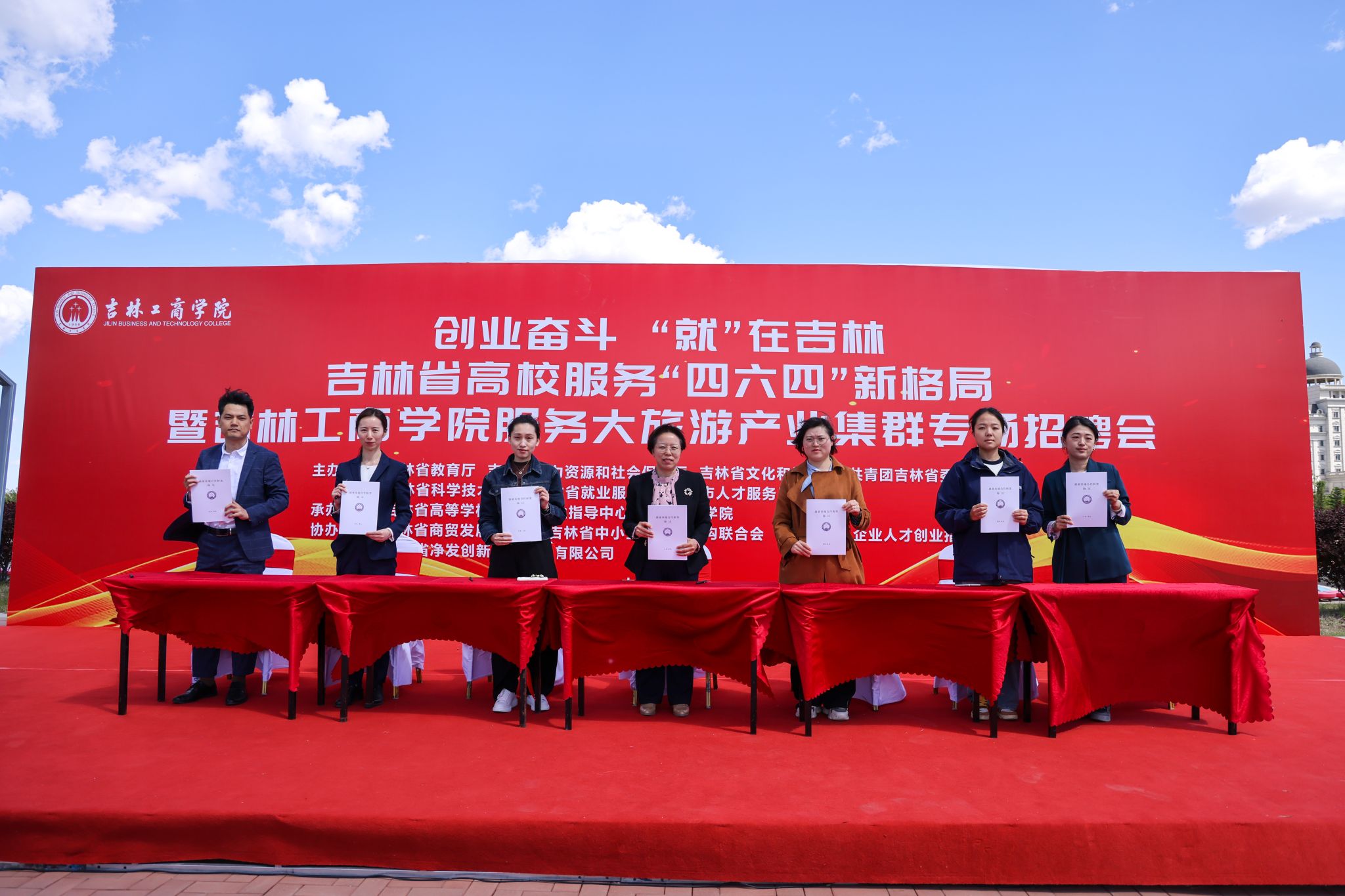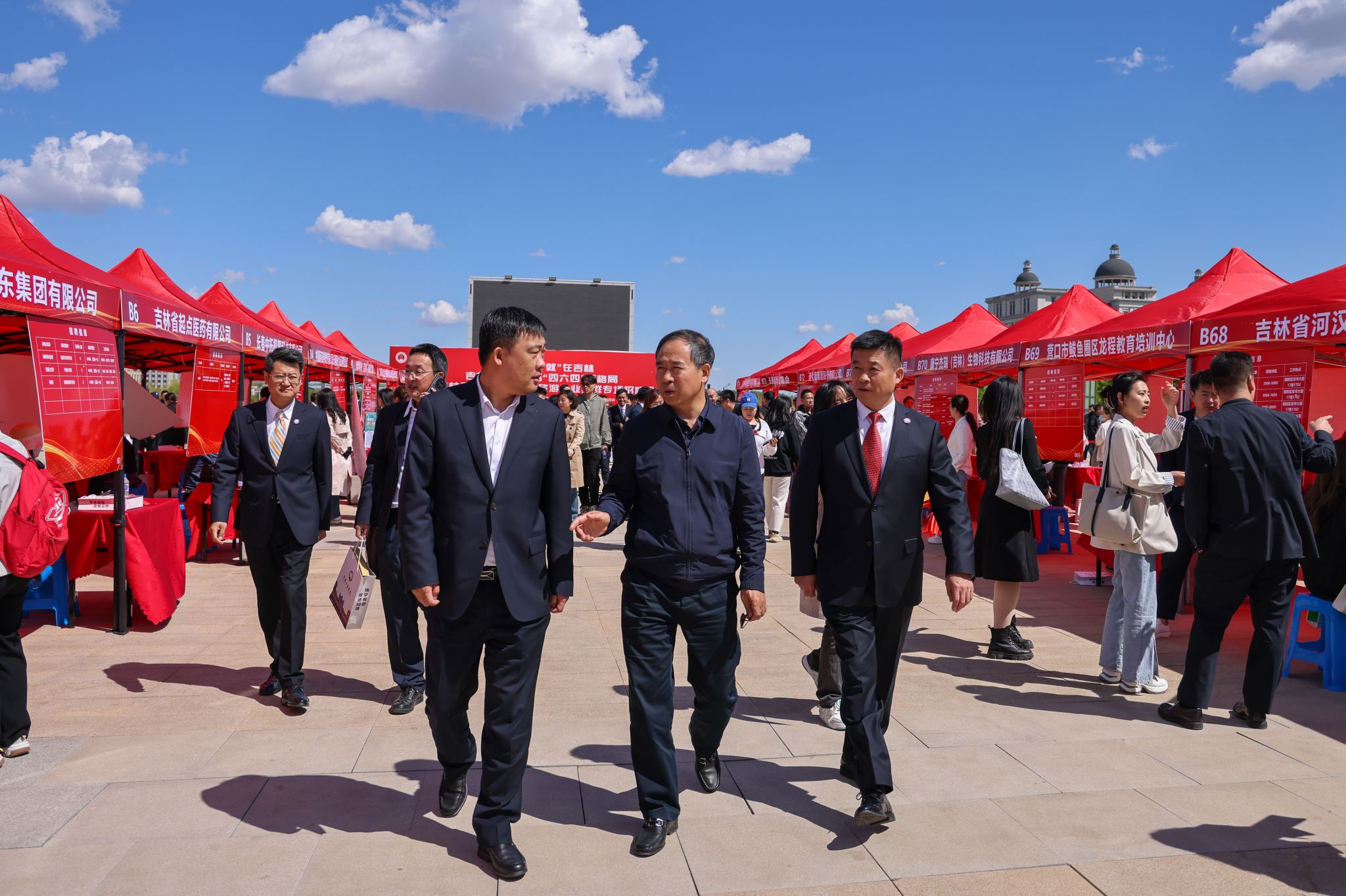为深入贯彻党中央、国务院关于做好高校毕业生就业工作决策部署,落实省委、省政府关于就业工作的要求,主动对接服务吉林省“一主六双”高质量发展战略,推进毕业生留吉就业创业,5月15日,学校在文化广场举办“创业奋斗‘就’在吉林”吉林省高校服务“四六四”新格局暨吉林工商学院服务大旅游产业集群专场招聘会。省教育厅一级巡视员许世彬,省文化和旅游厅副厅长张建平,省高校毕业生就业指导中心主任唐洪丰等上级机关领导及省、市、区有关部门负责同志,吉林省净发创新投资集团有限公司党委副书记高军,吉林建龙钢铁有限责任公司副总经理张继武等企业代表以及吉林工商学院党委副书记杜希刚、迟柏龙,副校长张熙奀、管清平出席招聘会启动仪式。