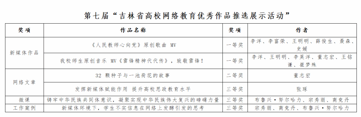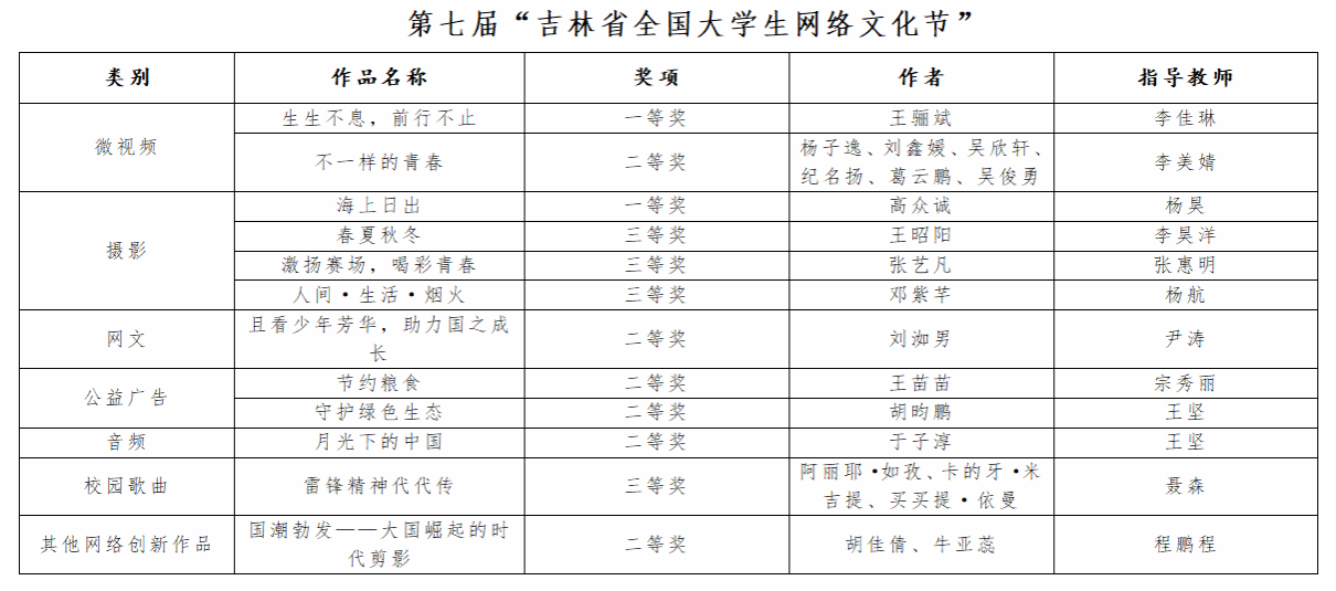日前,吉林省教育厅公布了第七届吉林省大学生网络文化节和全省高校网络教育优秀作品推选结果,我校共有18件作品在微课、网络文章、工作案例、新媒体作品、微视频、摄影、网文、公益广告、音频、校园歌曲以及其他网络创新作品评选中获奖。其中,一等奖4项、二等奖7项、三等奖7项。