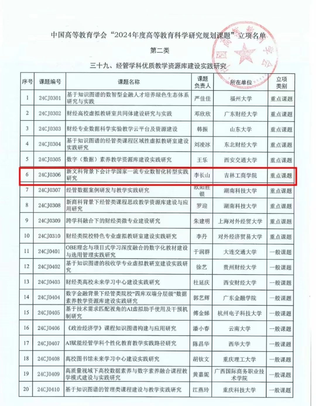 近日,中国高等教育学会“2024年度高等教育科学研究规划课题”立项结果正式公布。经中国高等教育学会资格审查、匿名评审及公示,我校会计学院院长李长山教授申报的《新文科背景下会计学国家一流专业数智化转型实践研究》喜获中国高等教育学会规划重点课题立项。