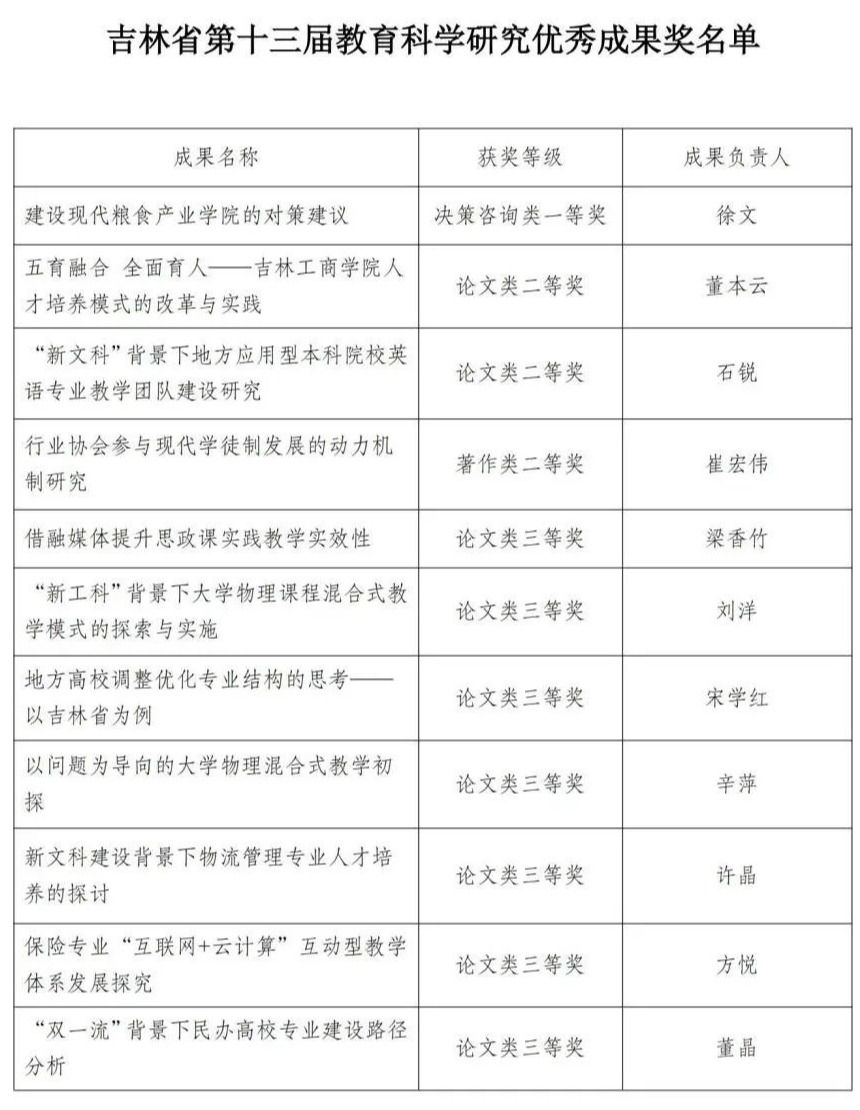 两年一次的吉林省教育科学研究优秀成果奖是我省教育科研领域树立精品意识,引领教育科研发展方向,以高质量科研成果推动教育强国建设和中国式现代化建设的重要奖项。本次获奖成果涉及我校在专业建设、课程建设、人才培养模式改革与实践等方面取得的优秀教研成果,充分展示了我校教师在教育教学创新、教学方法改革、思政课建设等方面的深入思考和积极探索。