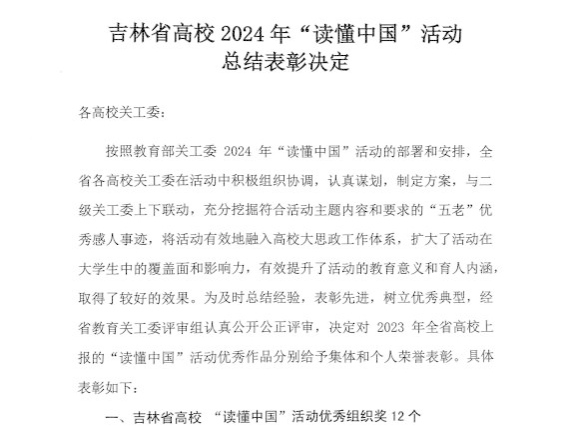 近日,由吉林省委教育工委在全省高校举办的2024年吉林省高校关工委“读懂中国活动”评选结果公布,我校荣获优秀组织奖,视频类金奖1个、银奖9个,征文类银奖8个。
