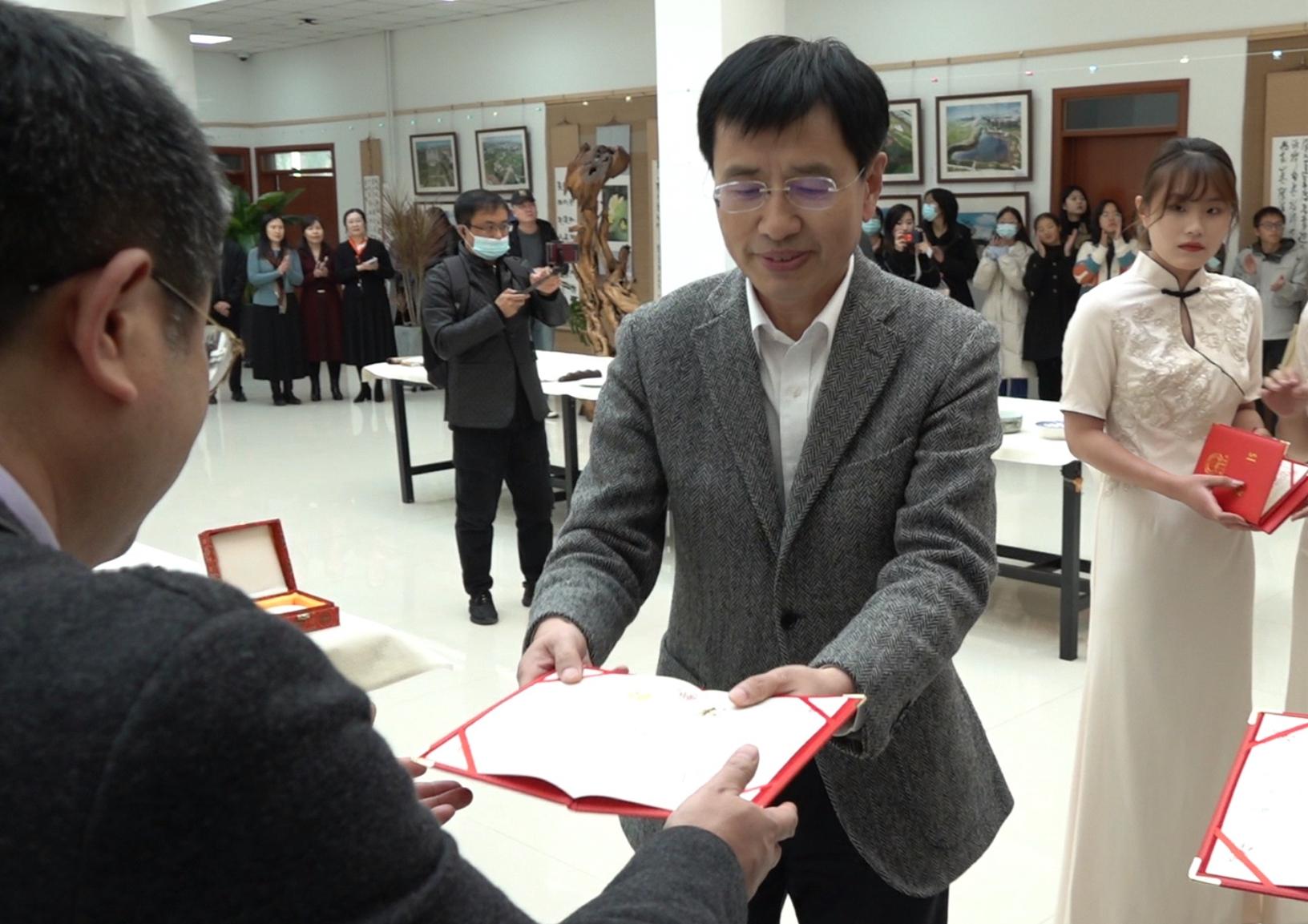 开幕式上,张越杰向书画名家颁发了吉林工商学院客座教授聘书,邀请他们定期来学校参加美育大讲堂活动,弘扬中华优秀传统文化,指导师生书画爱好者开展艺术创作,共襄文化育人盛举。开幕式上,景喜猷向我校赠送了校名牌匾,表达了艺术家们对教育事业的关心,对吉林工商学院青年学子的厚爱。