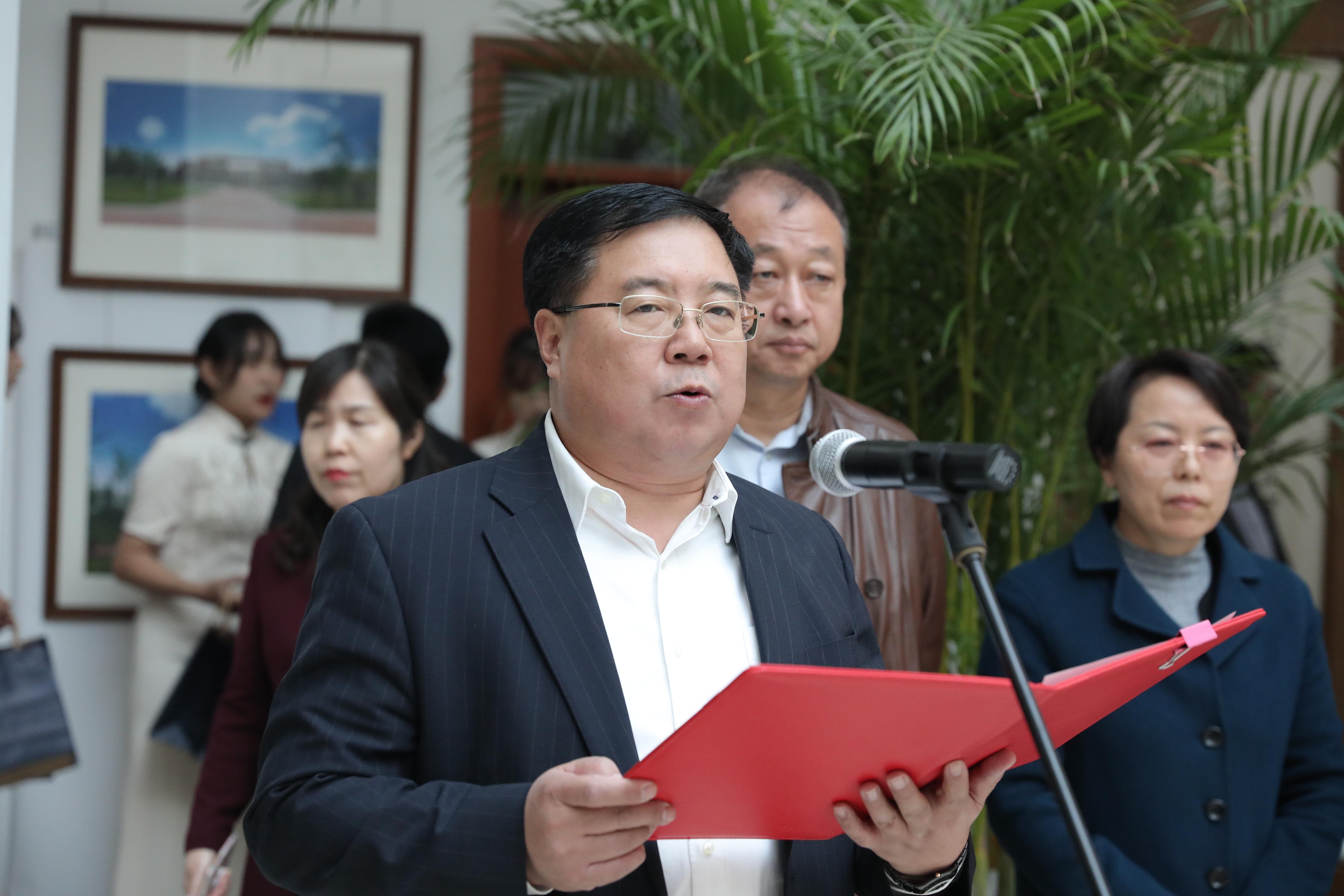 张炳辉在开幕式上致辞,他首先代表全校师生对吉林省当代书画名家光临学校表示热烈欢迎,对书画名家现场助力我校美育工作和校园文化建设表示衷心感谢。文化是一所高校的灵魂,书画则是中国传统文化突出的标志,承载着“传承中国书画艺术,弘扬中华美育传统”的使命,也是大学生培育和践行社会主义核心价值观的重要载体。张炳辉指出,希望通过开展书画名家进校园现场展示和讲解,使广大师生感受传统文化的艺术魅力,树立正确的审美观念,陶冶高尚的道德情操,塑造美好心灵。今后,学校将定期举办美育大讲堂活动,拓展美育实践教学,丰富校园美育文化生活,挖掘“大美育”理念下的多种类美育资源,积极构建“大美育”审美教育体系,打造新型美育实践与研究新平台,切实推动我校美育工作和校园文化建设。