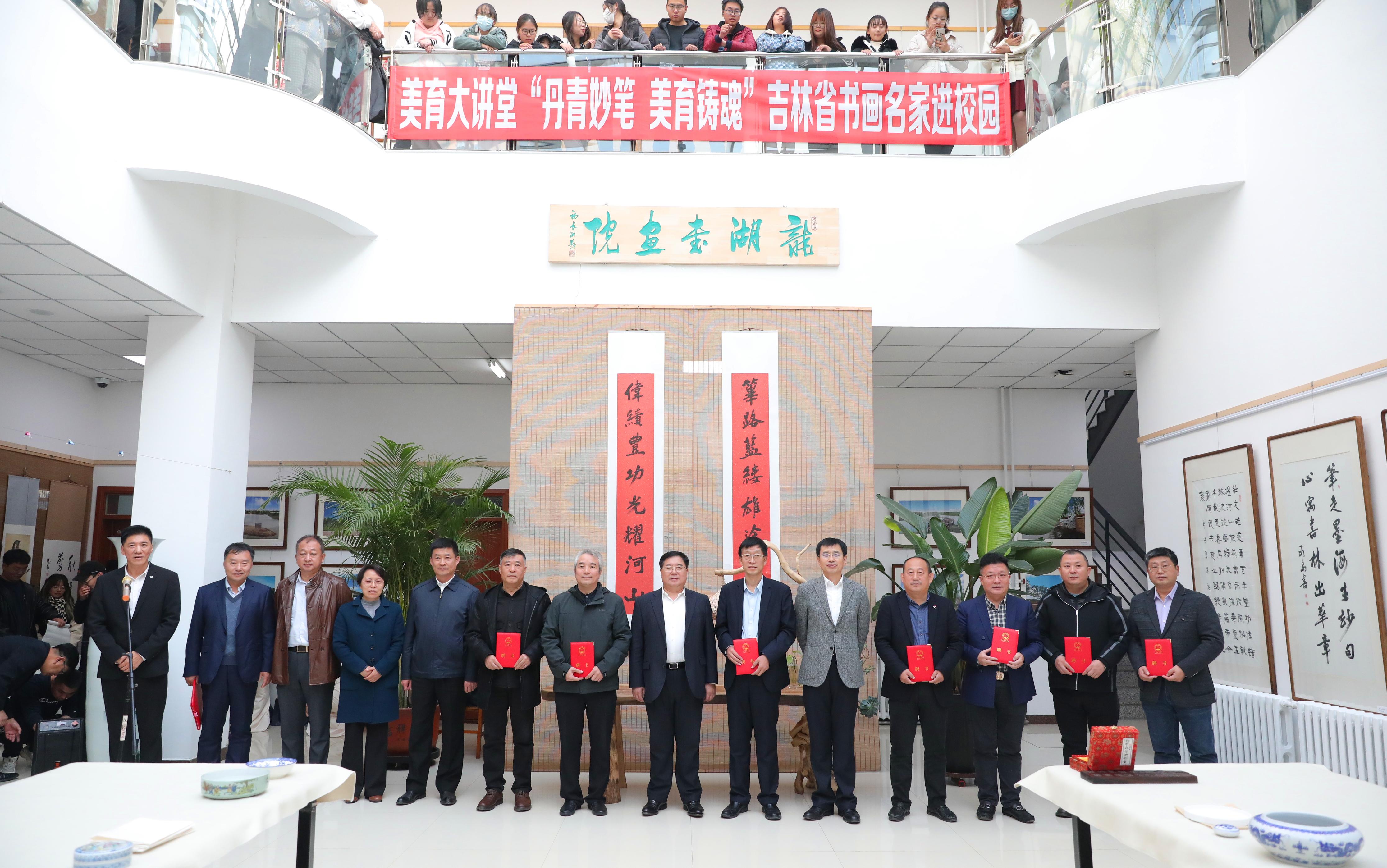 金秋收获,四野鎏金。10月20日下午,由美育文化中心、党委宣传部、团委和图书馆联合举办的“丹青妙笔,美育铸魂”吉林省书画名家进校园共建美育大讲堂活动在图书馆一楼大厅举行。校党委书记张炳辉,党委副书记、校长张越杰,吉林省文联一级巡视员、中国书法家协会理事、吉林省书法家协会副主席景喜猷,吉林省文联副主席、党组成员、吉林省政协书画院副院长赵志强出席开幕式活动。党委副书记杜希刚,副校长张熙奀参加了开幕式。开幕式由副校长刘君义主持。