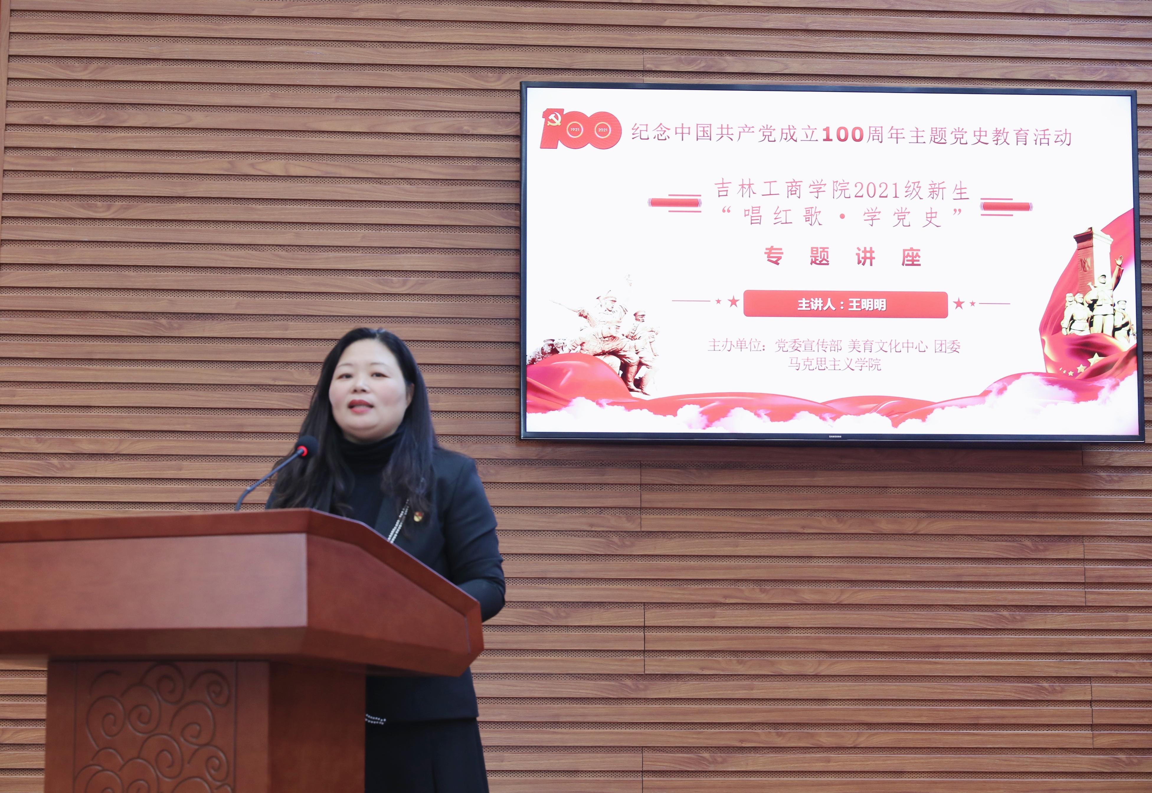 为庆祝中国共产党成立100周年,10月27日,由我校党委宣传部、美育文化中心、团委、马克思主义学院联合举办的吉林工商学院2021级新生“唱红歌•学党史”专题讲座在第二教学楼429报告厅举行。讲座邀请美育文化中心主任王明明担任主讲。讲座由党委宣传部部长耿琪主持。马克思主义学院副院长薛俊生、马克思主义学院教师代表、活动主办单位有关同志参加了讲座,200余名新生在现场聆听了讲座。