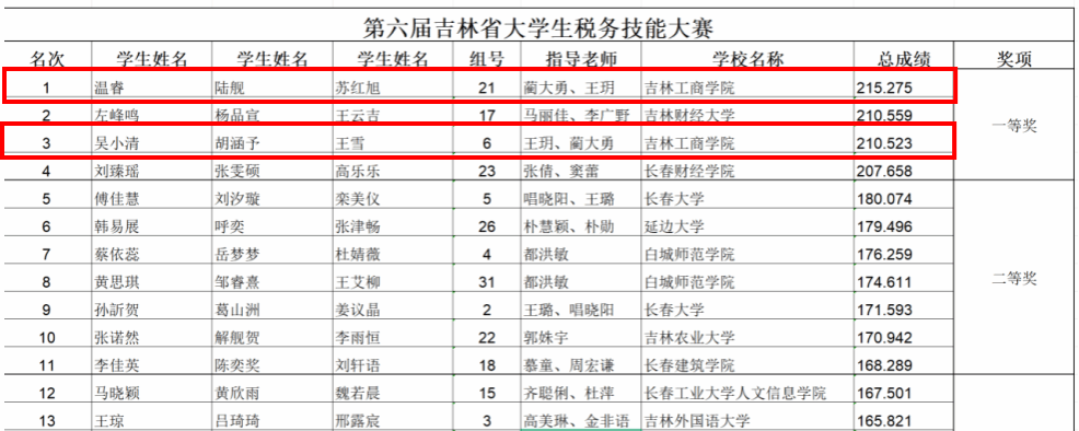 财税学院高度重视本次大赛,积极组织学生参赛,教师悉心指导,参赛同学刻苦训练。最终,由蔺大勇老师带队,温睿、陆舰、苏红旭组成的吉林工商学院一队,王玥老师带队,吴小清、胡涵予、王雪组成的吉林工商学院二队分别以团队总分第一、第三名的成绩荣获“吉林省大学生税务技能大赛一等奖”。