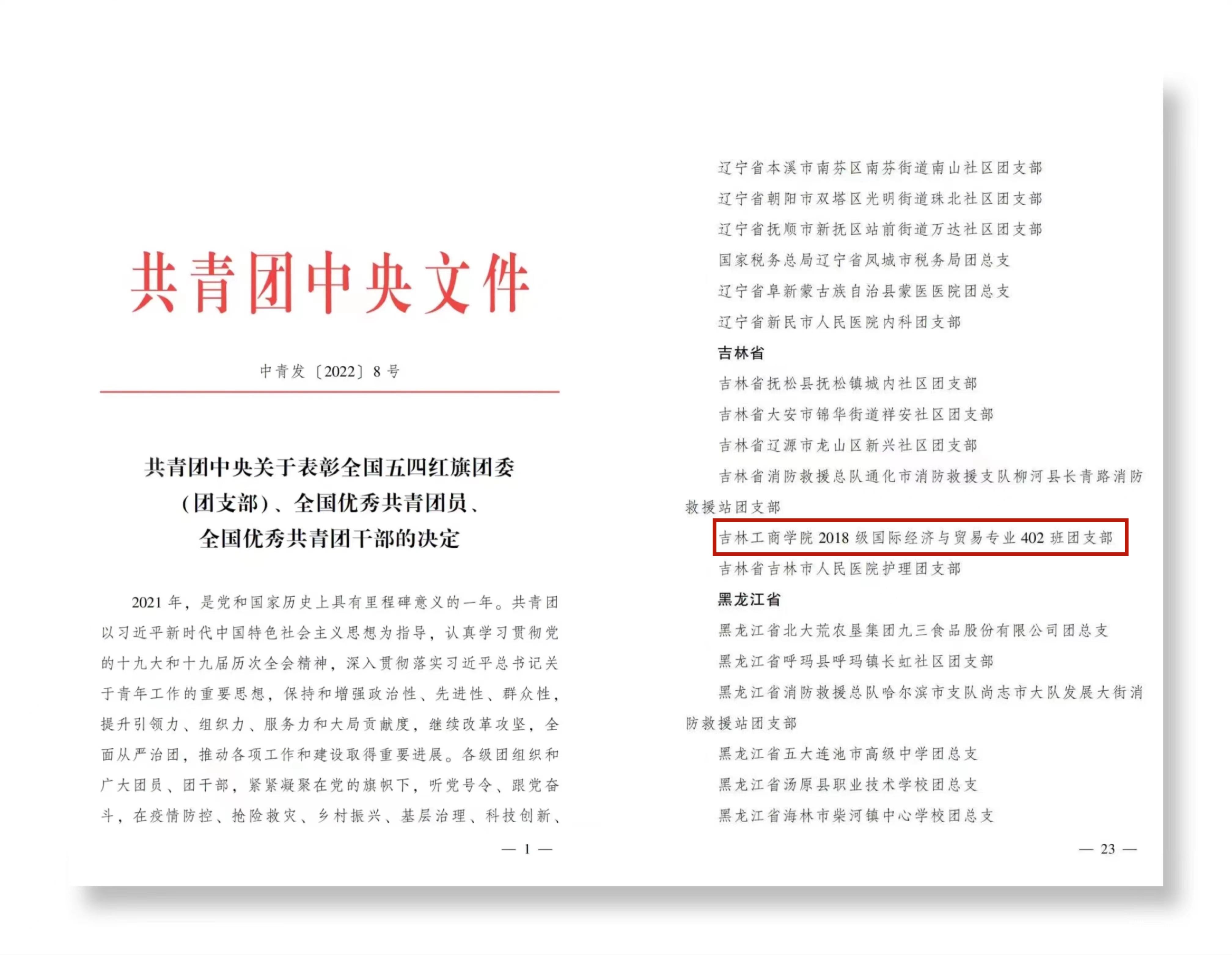 2022年是中国共青团成立100周年,在“五四青年节”前夕,共青团中央下发了《关于表彰全国五四红旗团委(团支部)、全国优秀共青团员、全国优秀共青团干部的决定》,我校经贸学院2018级国际经济与贸易专业402班团支部获评“全国五四红旗团支部”荣誉称号。这是共青团中央授予全国基层团组织的最高荣誉,也是我校共青团工作的历史性突破。此次表彰吉林省仅有2所高校荣获集体荣誉,我校是省内唯一获此殊荣的高校。