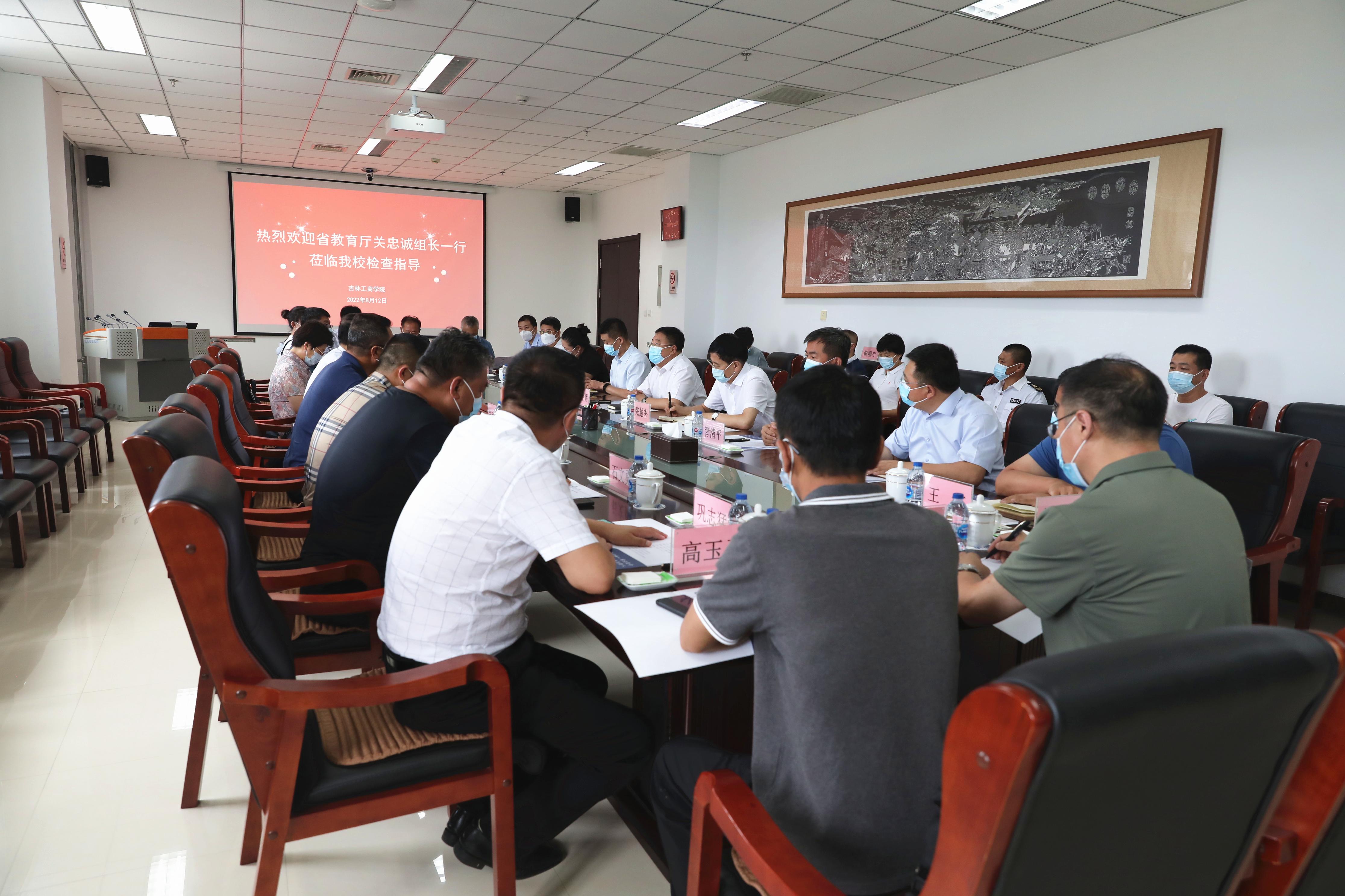 张炳辉代表学校领导班子对关忠诚一行莅临指导表示热烈欢迎,对省教育厅和九台区委、区政府、卡伦街道对学校防疫工作的支持帮助和指导表示衷心感谢。他强调,学校将严格按照省委、省政府决策部署和省教育厅有关要求,结合检查组的指导意见,发挥强项、补齐短板,将疫情防控工作落实落细,全力做好疫情防控工作,确保秋季学期开学工作平稳有序。