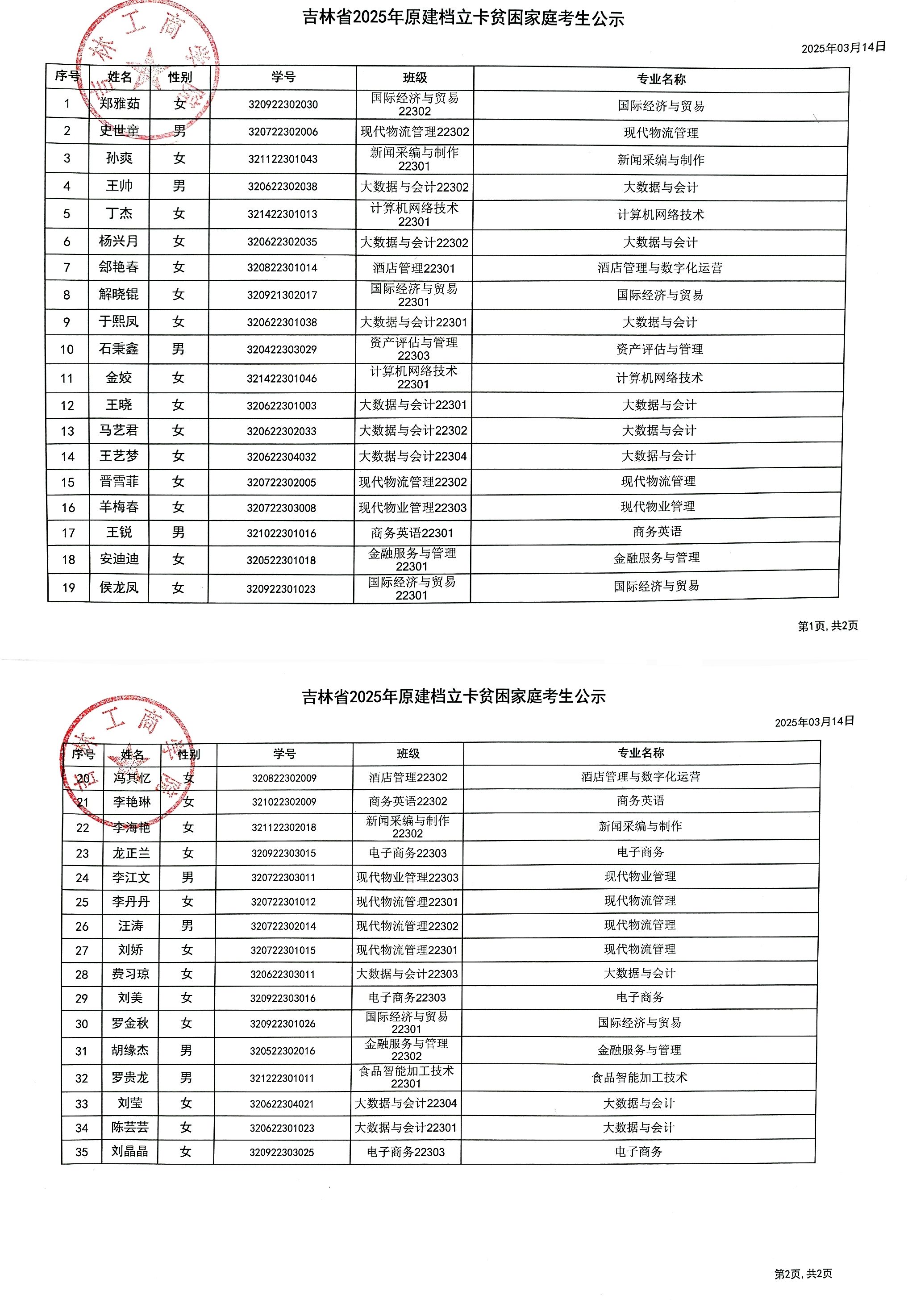 根据《关于做好吉林省2025年普通高等学校专升本考试招生工作的通知》有关精神,经学生本人申请,学生所在教学学院初审,我校学生资助中心复审,我校有35名学生通过学校审核,现将35名原建档立卡贫困家庭考生名单予以公示,公示时间从2025年3月14日至2025年3月21日。如有异议,请拨打电话:0431-82306253。