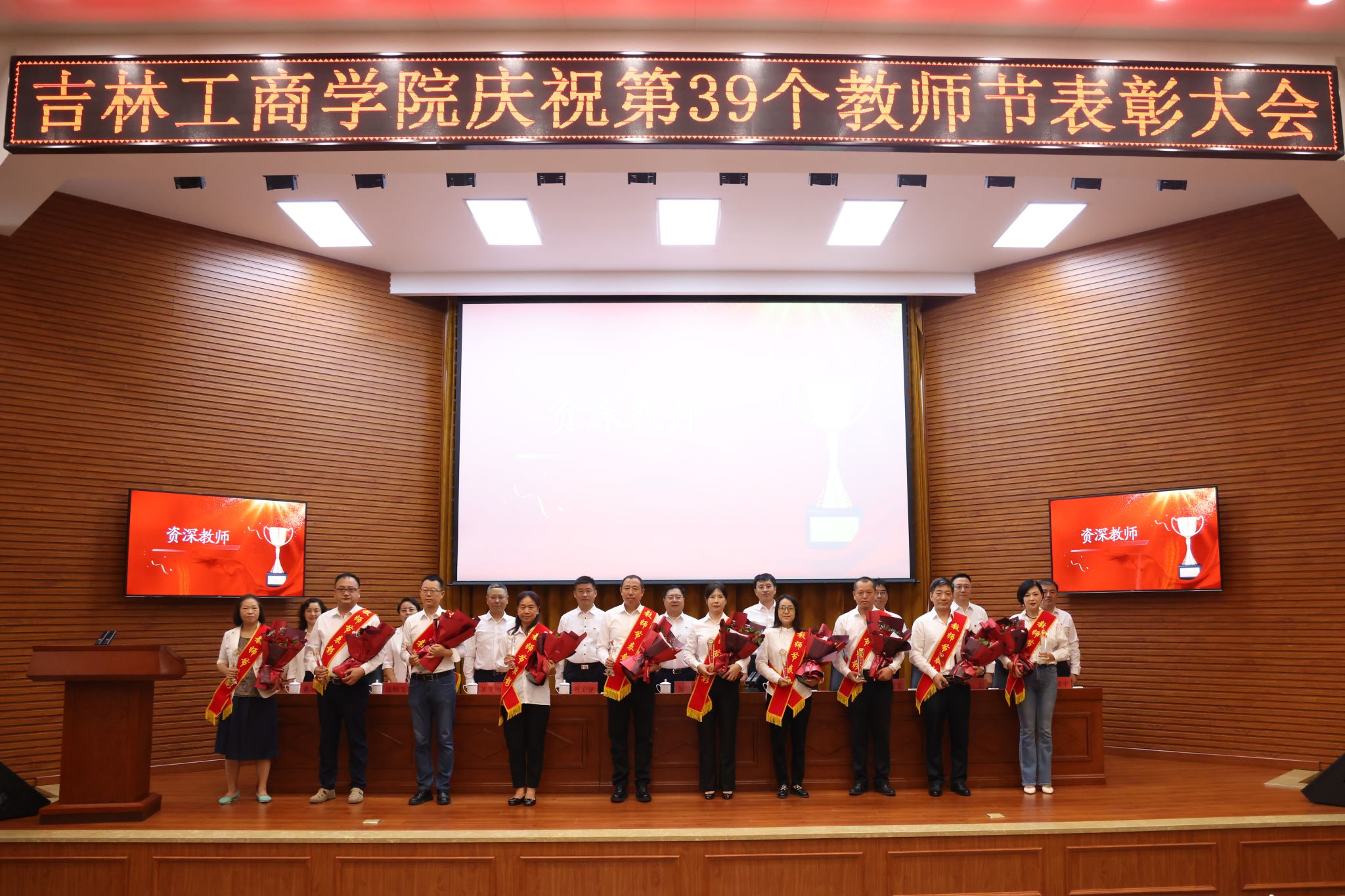 管清平宣读了《关于表彰师德标兵、优秀教师、优秀教育工作者和资深教师的的决定》。大会对获得师德标兵、优秀教师、优秀教育工作者、资深教师称号的教师进行了表彰,与会领导为获奖教师颁发了荣誉证书和奖杯,学生代表为获奖教师献花。