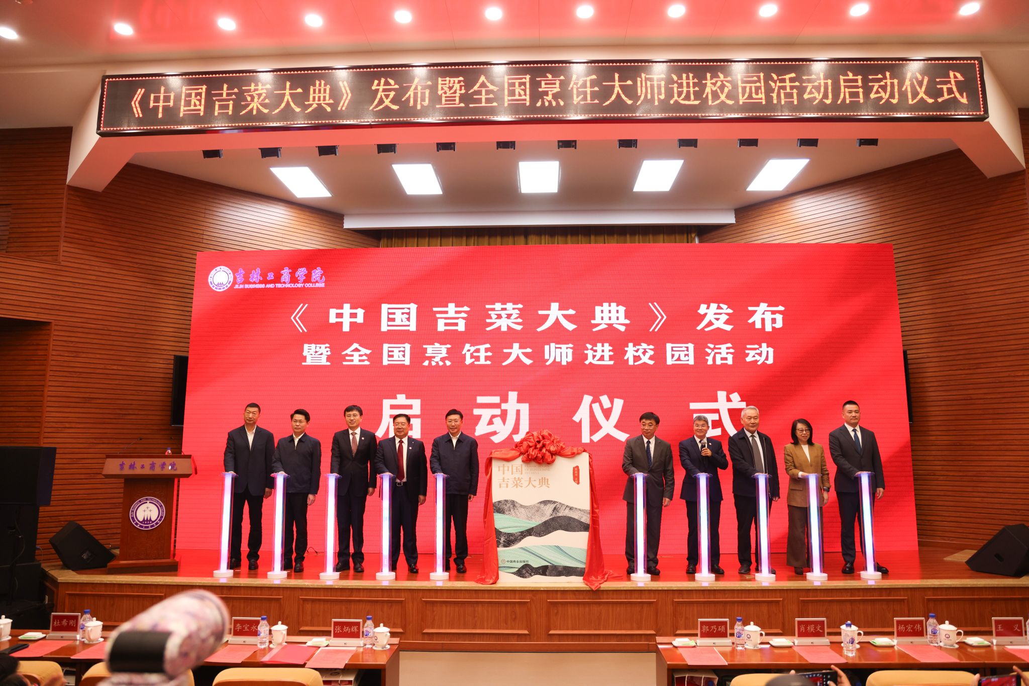 与会领导及嘉宾共同按下启动柱,《中国吉菜大典》发布暨全国烹饪大师进校园活动正式启动。吉林工商学院还聘请了11名业界专家为客座教授,张炳辉为客座教授颁发聘任证书。全国烹饪大师魏志春表示,将全力支持吉林工商学院的烹饪教育工作,与学校携手合作,共同推动烹饪教育高质量发展。