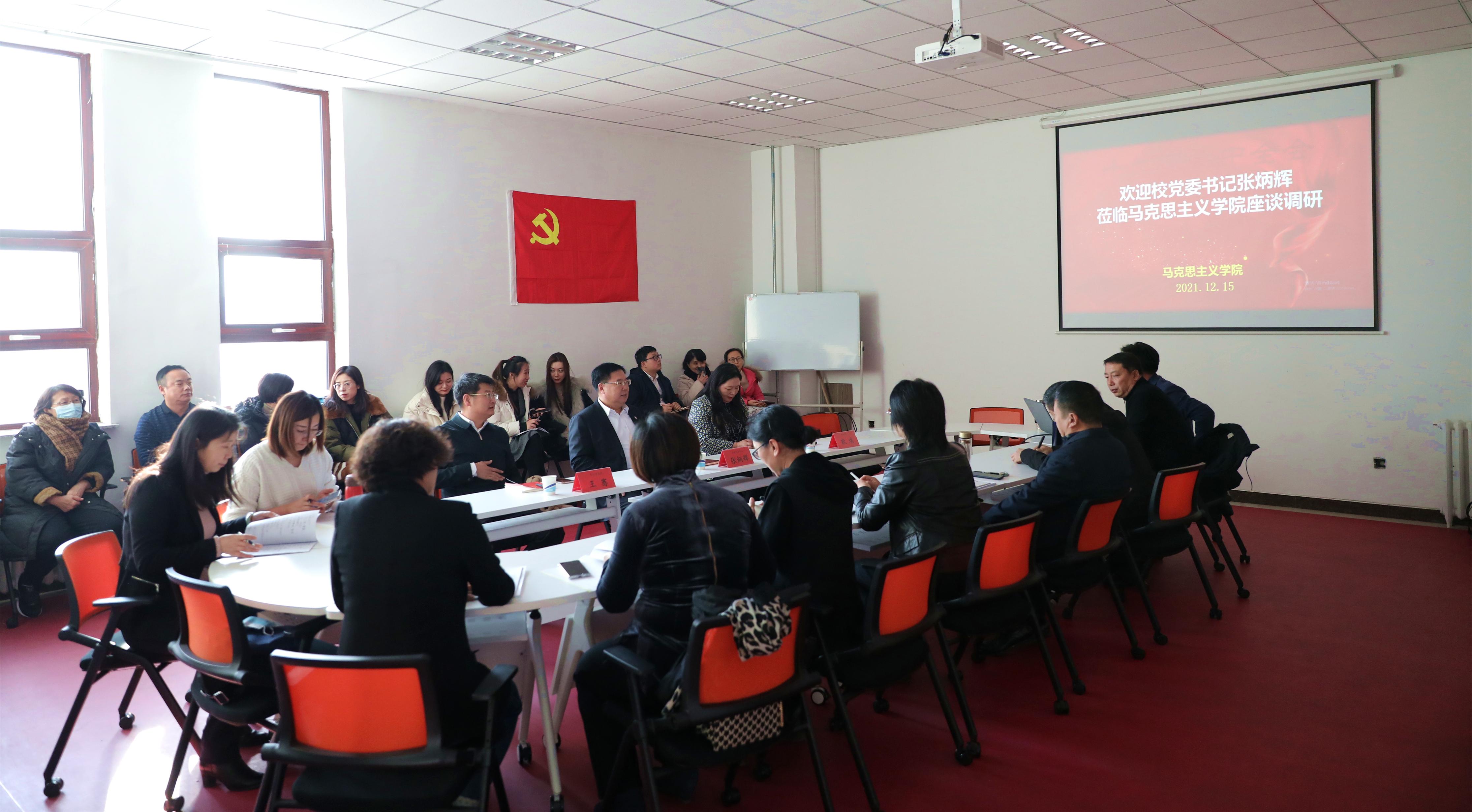 12月15日下午,党委书记张炳辉到马克思主义学院调研,并与教师进行了座谈。党委宣传部部长耿琪、学院办公室主任王骞陪同调研,调研座谈会由马克思主义学院院长韩杰主持,马克思主义学院党政领导班子和全体教师参会。