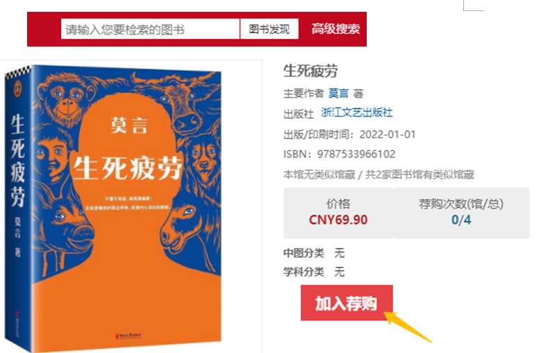 点击首页的【图书发现】可查看图书列表,进入图书详情页面后点击【加入荐购】即可完成。