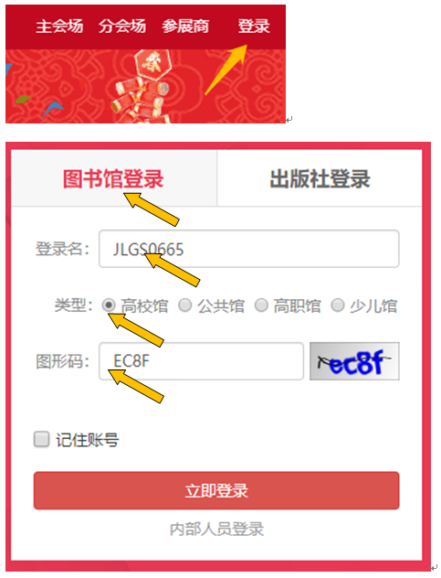 选择【图书馆登录】→输入【登录名】→选择单位类型【高校馆】→输入【图形码】登录。